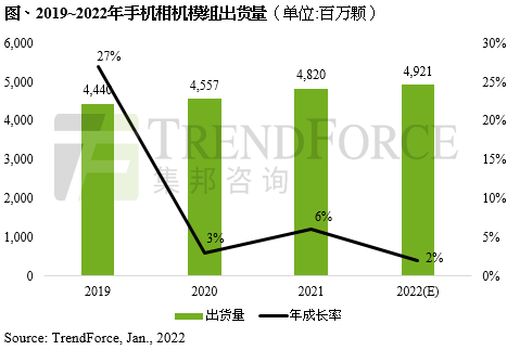 近年智能手机相机模组的最大趋势为后置镜头的数量持续增加,根据TrendForce集邦咨询研究显示,三镜头在2020年超越双镜头成为主流,带动智能手机相机模组出货量持续成长,预估2022年智能手机相机模组出货量有望达49.2亿颗,年增2%。