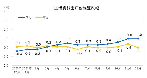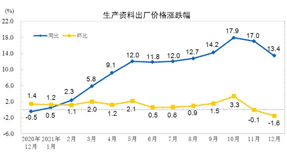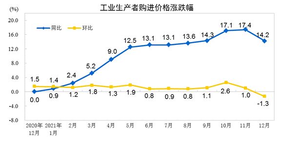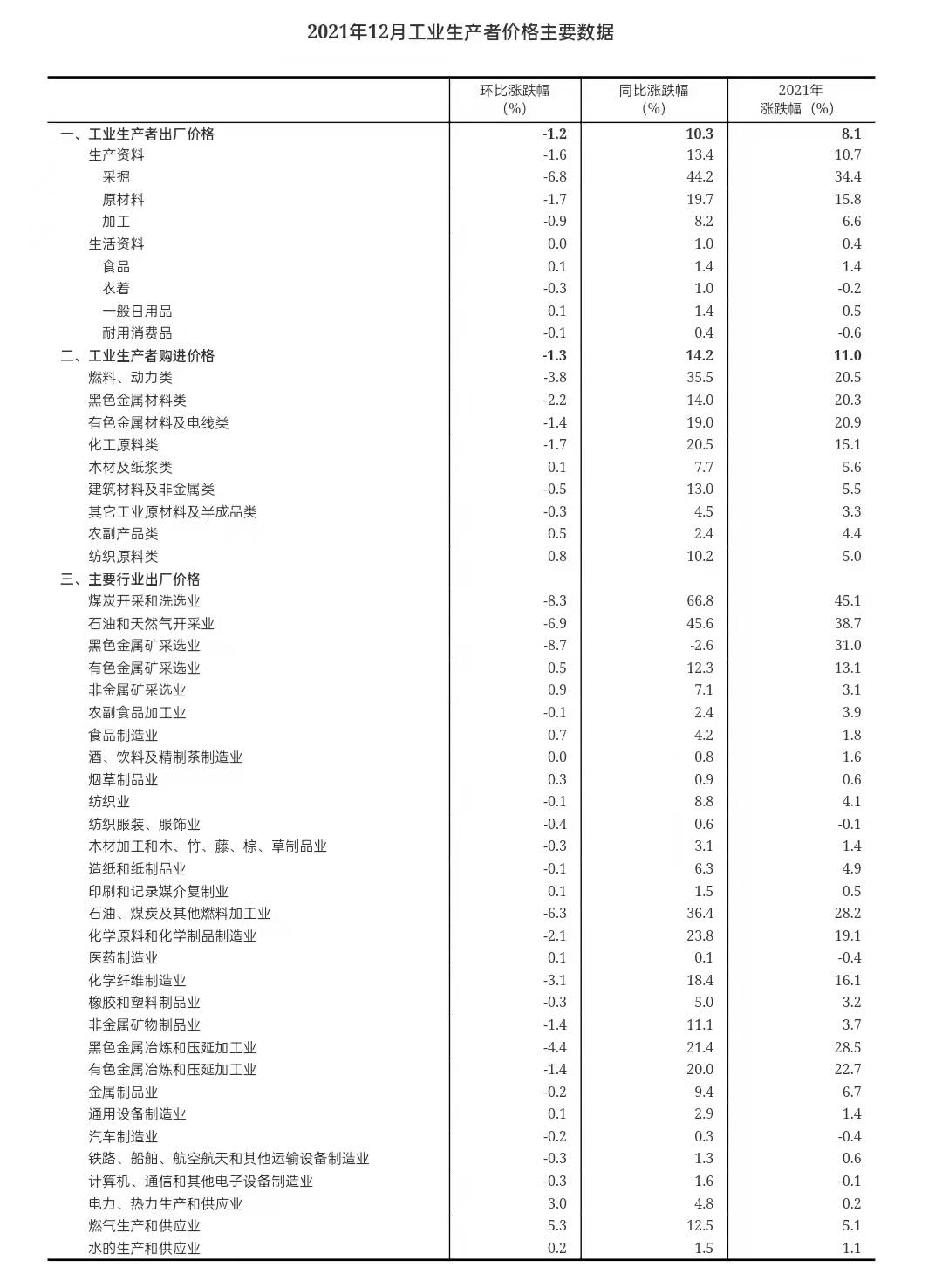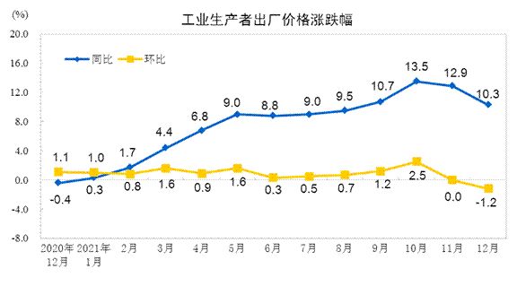2021 年 12 月份,全国工业生产者出厂价格同比上涨 10.3%,环比下降 1.2%;工业生产者购进价格同比上涨 14.2%,环比下降 1.3%。2021 年全年,工业生产者出厂价格比上年上涨 8.1%,工业生产者购进价格上涨 11.0%。