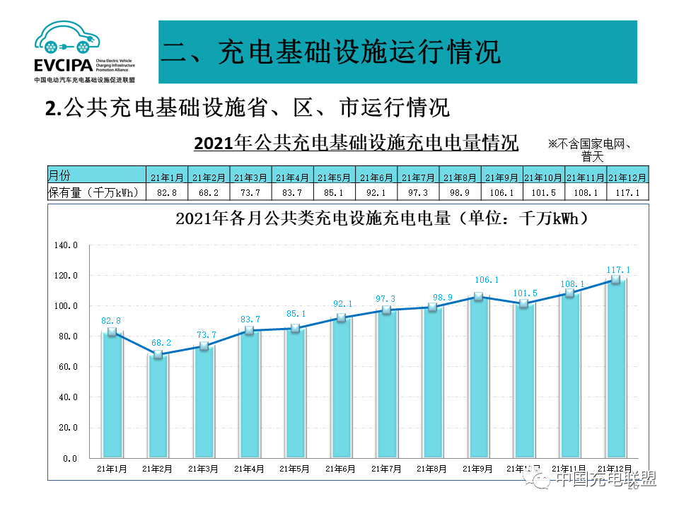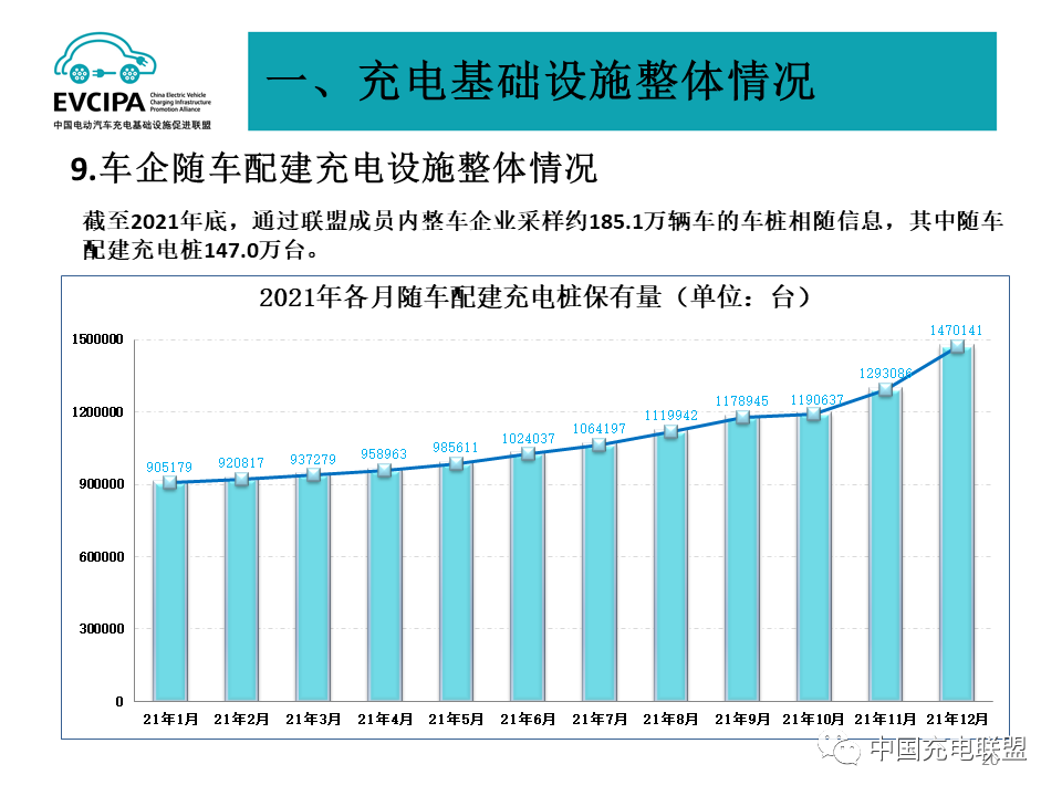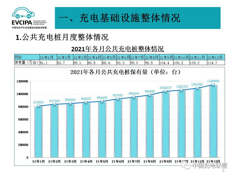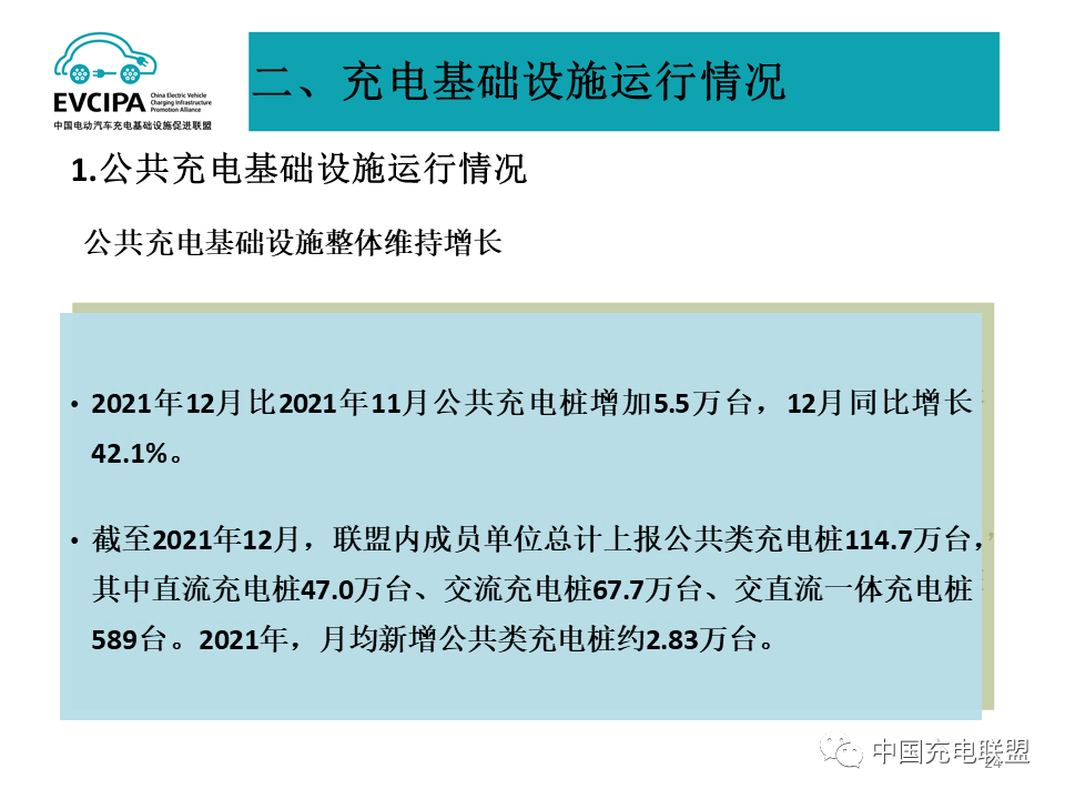 1、公共充电基础设施运行情况,2021年12月比2021年11月公共充电桩增加5.5万台,12月同比增长42.1%。截至2021年12月,联盟内成员单位总计上报公共类充电桩114.7万台,其中直流充电桩47.0万台、交流充电桩67.7万台、交直流一体充电桩589台。2021年,月均新增公共类充电桩约2.83万台。
