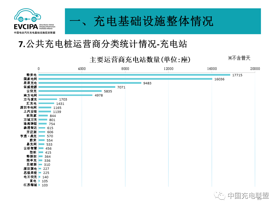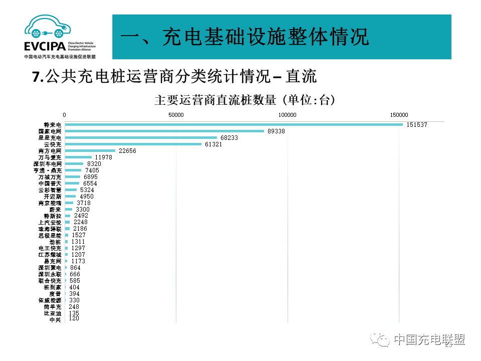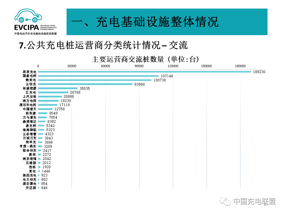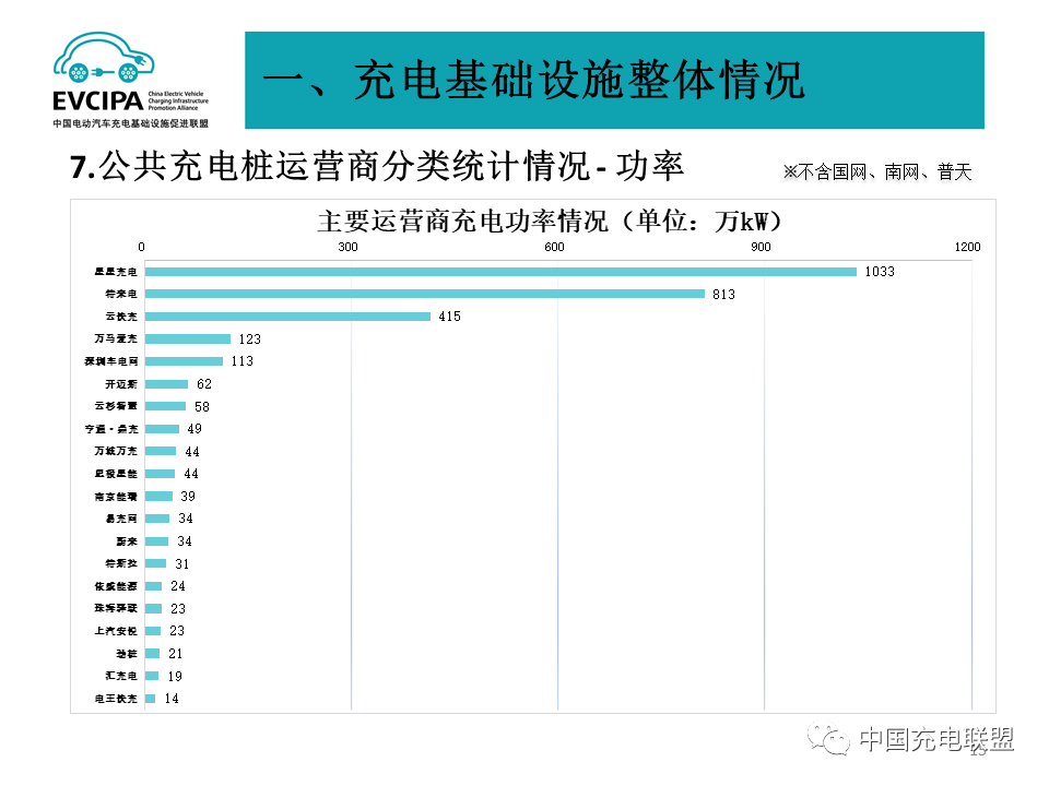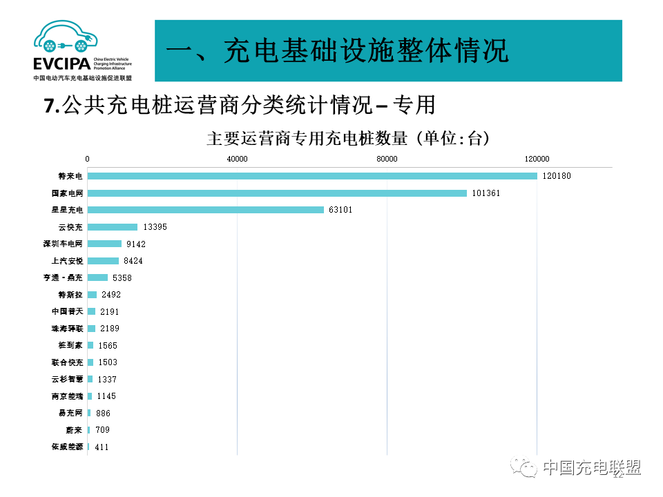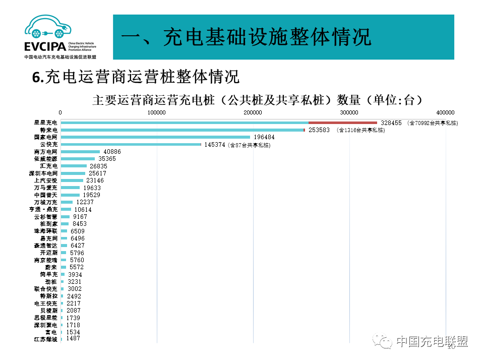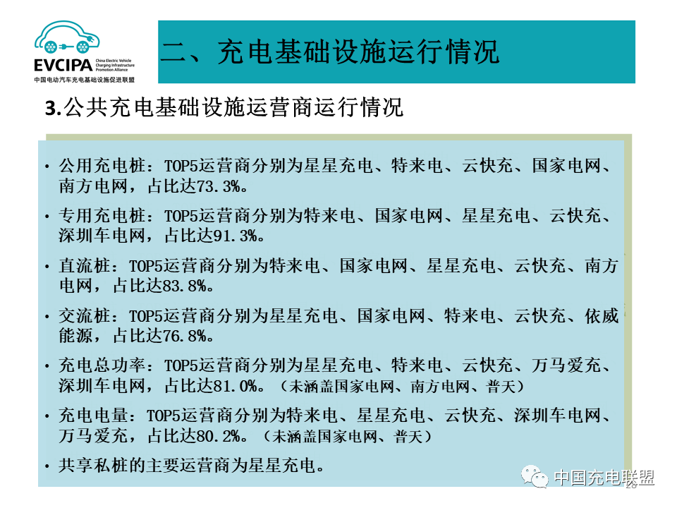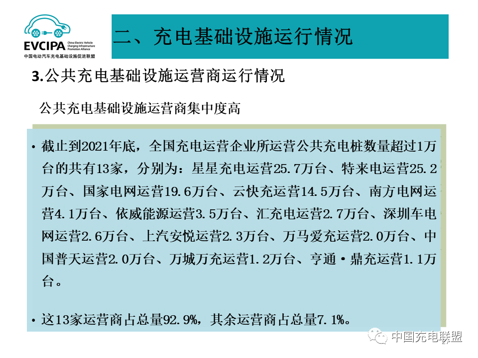 3、公共充电基础设施运营商运行情况,截止到2021年底,全国充电运营企业所运营公共充电桩数量超过1万台的共有13家,分别为:星星充电运营25.7万台、特来电运营25.2万台、国家电网运营19.6万台、云快充运营14.5万台、南方电网运营4.1万台、依威能源运营3.5万台、汇充电运营2.7万台、深圳车电网运营2.6万台、上汽安悦运营2.3万台、万马爱充运营2.0万台、中国普天运营2.0万台、万城万充运营1.2万台、亨通·鼎充运营1.1万台。这13家运营商占总量92.9%,其余运营商占总量7.1%。