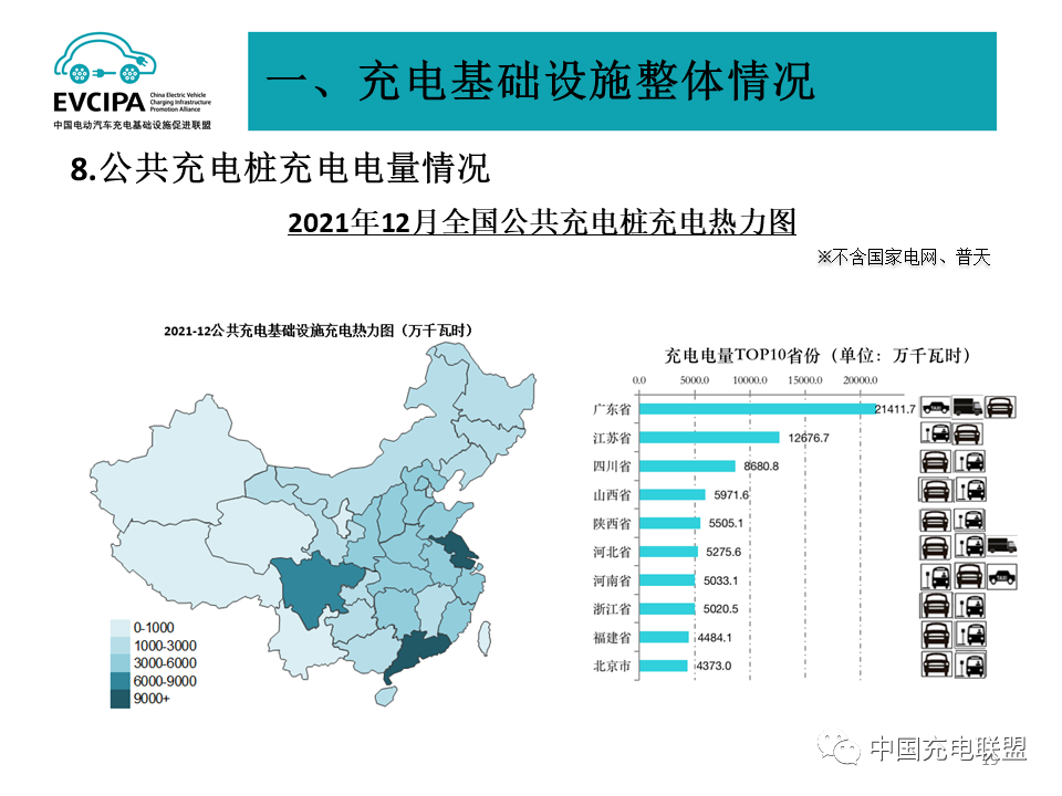 2、公共充电基础设施省、区、市运行情况,广东、上海、江苏、北京、浙江、山东、湖北、安徽、河南、福建TOP10地区建设的公共充电基础设施占比达71.7%。全国充电电量主要集中在广东、江苏、四川、山西、陕西、河北、河南、浙江、福建、北京等省市,电量流向以公交车和乘用车为主,环卫物流车、出租车等其他类型车辆占比较小。2021年12月全国充电总电量约11.71亿kWh,比上月增加0.89亿kWh,同比增长42.0%,环比增长8.3%。
