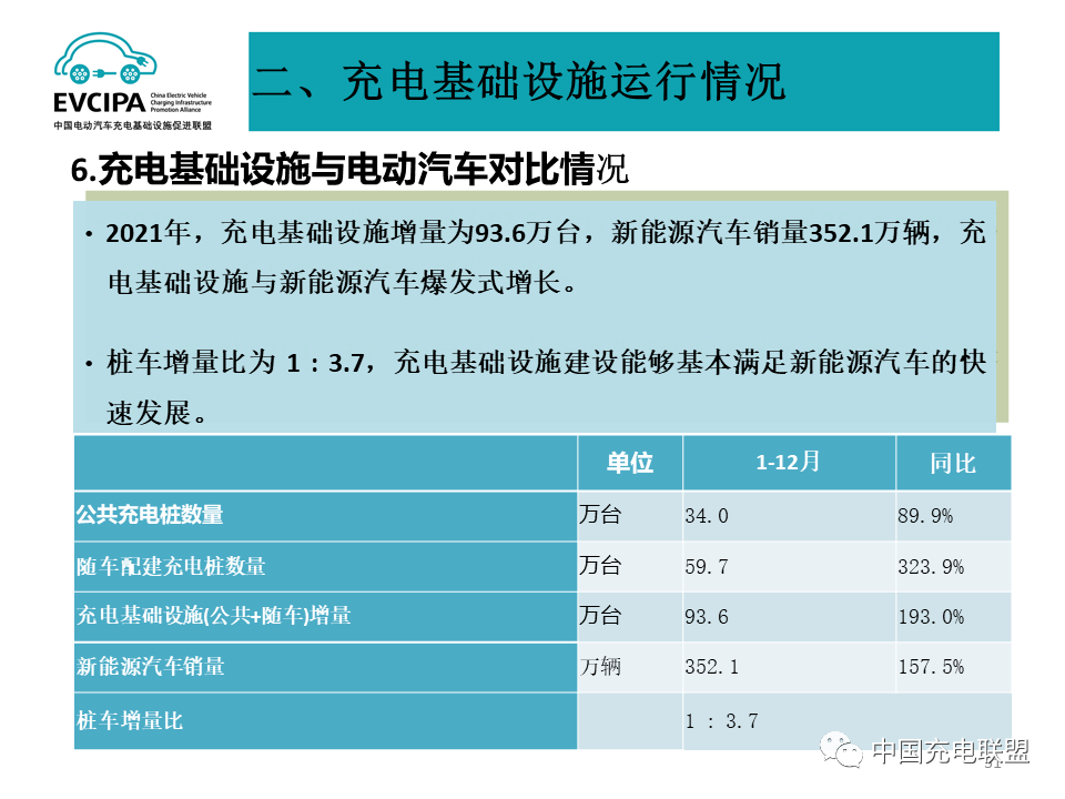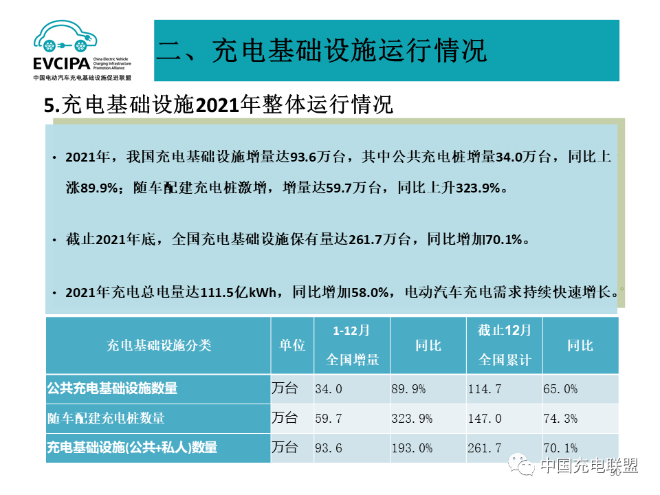 5、充电基础设施整体运行情况,2021年,我国充电基础设施增量达93.6万台,其中公共充电桩增量34.0万台,同比上涨89.9%;随车配建充电桩激增,增量达59.7万台,同比上升323.9%。截止2021年底,全国充电基础设施保有量达261.7万台,同比增加70.1%。2021年充电总电量达111.5亿kWh,同比增加58.0%,电动汽车充电需求持续快速增长。