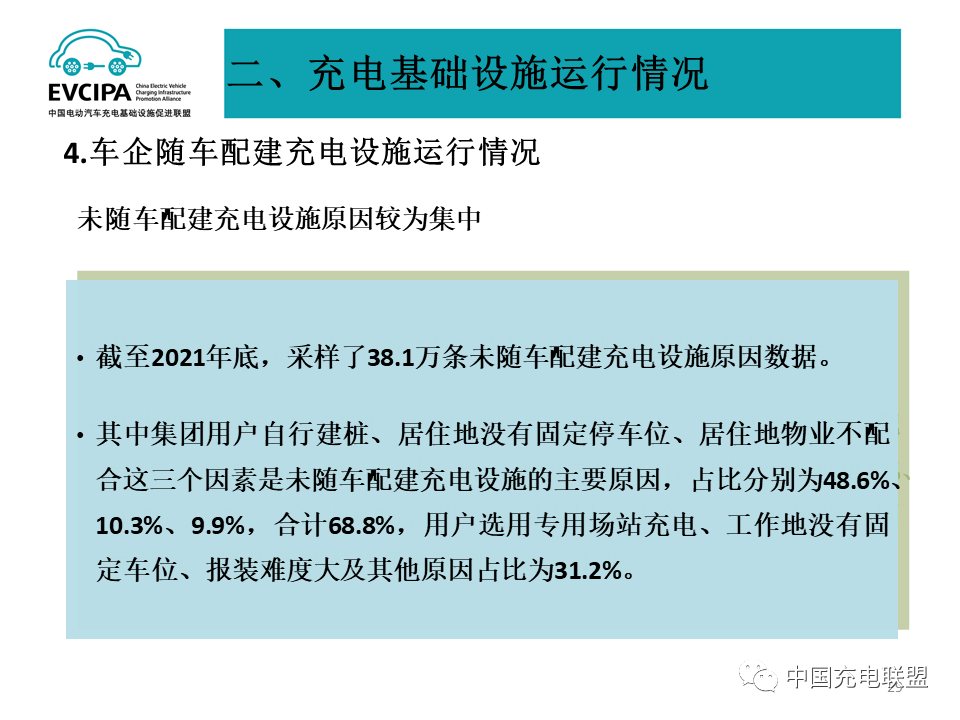 4、车企随车配建充电设施运行情况,截至2021年底,采样了38.1万条未随车配建充电设施原因数据。其中集团用户自行建桩、居住地没有固定停车位、居住地物业不配合这三个因素是未随车配建充电设施的主要原因,占比分别为48.6%、10.3%、9.9%,合计68.8%,用户选用专用场站充电、工作地没有固定车位、报装难度大及其他原因占比为31.2%。