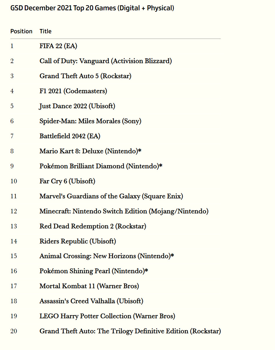 以下是2021年12月英国游戏软件销量榜(数字+实体版):