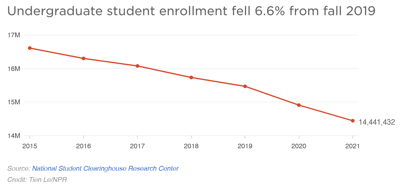 跟大流行病开始之前相比,现在美国上大学的学生减少了100多万。根据当地时间周四公布的新数据,美高校在2021年秋季减少了近50万名本科生,这延续了从前年秋季开始的历史性下降。