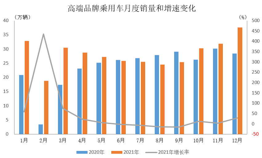 2021 年 12 月,高端品牌乘用车销量完成 37.6 万辆,同比增长 28.8%。