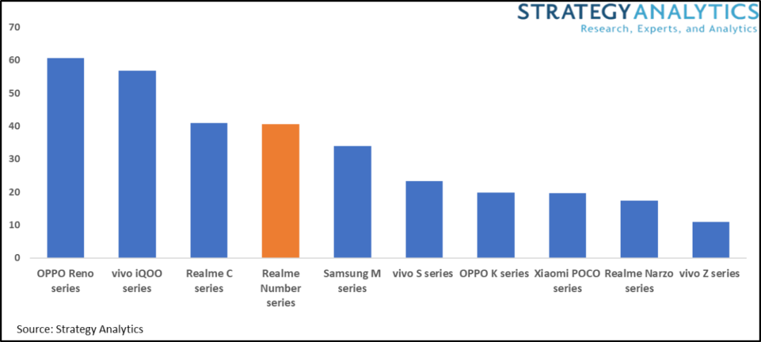 realme的Number系列以4060万的出货量在“新时代智能手机家族”排名中位居第四 Strategy Analytics指出,realme的Number系列在“新时代智能手机家族”排名中位居第四,累计出货量为4060万部。“新时代智能手机家族”主要聚焦2018年以来推出的手机系列。 Strategy Analytics总监Woody OH表示:“realme的Number系列是最初引领realme在2018年进军智能手机市场的手机产品线。realme上市仅37个月,就成为全球智能手机出货量累计达到1亿部最快的品牌,而其Number系列产品一直处于达成这一里程碑的核心位置。” 图表一:2018年以来推出的智能手机家族累计出货量(百万部) Strategy Analytics高级分析师Rajeev Nair表示:“截至2021年Q3,realme Number系列累计出货量在‘新时代智能手机家族’排名中位居第四。在realme 的Number系列中,realme 5仍然是自2019年Q3发布以来累计出货量最好的迭代——在整个产品周期内,它的总出货量为1200万部。” Strategy Analytics高级分析师吴怡雯补充道:“自2021年以来,realme开始实施大规模的地缘多元化战略。其Number系列凭借高性价比的5G支持、提升的相机和屏幕功能性预计将再次在多国市场的推广和多元化受众的接受度方面发挥关键作用。” 来自:Strategy Analytics 更多阅读:Canalys:2023年Q2印度智能手机市场出货量稳定在3610万部 同比仅下降1%Counterpoint Research:预计2023年三星手机在全球42个市场位居份额第一俄《生意人报》:2022年自2月28日至3月13日中国智能手机在俄销量大涨安兔兔:2022年2月Android手机性价比榜 次旗舰不足千元Counterpoint::2022年Q1欧洲智能手机出货量只有4900万部 市场下降12%Counterpoint Research:2021年Q4苹果iPhone出货量达8150万部 超三星成为全球最大智能手机厂商Counterpoint:2022年Q3中国智能手机销量同比下降12% 环比增长5%Counterpoint Research:2021年Q1 realme智能手机销量同比增长451%Counterpoint:2022年Q4全球智能手机出货量为3.0264亿部 同比下降19%Canalys:2022年Q2东南亚智能手机出货量为2450万部 环比下滑7%Counterpoint Research:2022年Q2中国智能手机销量同比下降14.2%创新低Canalys:2022年Q4小米在印度智能手机市场痛失领先地位 跌到第三M.Video-Eldorado:2023年Q1中国智能手机品牌在俄份额超7成 高于去年的50%2022年5月中国智能手机占领俄罗斯智能手机销量的42% 高于去年同期的28%Canalys:2023年Q2全球智能手机出货量降至2.58亿部 苹果三星同比均下滑超过10%