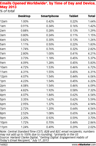 有人说与平板电脑比起来,台式机与智能手机的联系更紧密,尤其是当用户要阅读电子邮件时,这点更为确定。用户使用台式机和手机打开邮件的时间集中在早晨十点至下午四点之间——通常是在工作日,而使用平板电脑看邮件的时间则多数集中在晚间,下午六点到晚上十点之间。