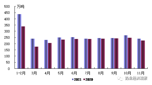2021 年 1-11 月全国液态奶产量 2580.08 万吨,同比增长 9.60%