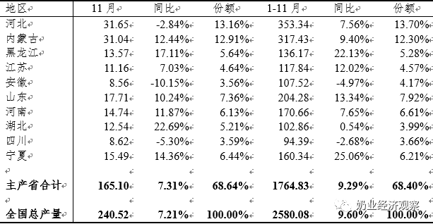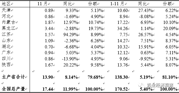 1-11 月,奶粉产量前 5 省份中,河北、黑龙江产量同比下降,合计 70.71 万吨,同比增长 3.68%,占全国总产量 81.23%,黑龙江 32.63 万吨,同比下降 0.99%,占总产量 37.49%,居第一位。11 月,这 5 省份合计 8.38 万吨,同比增长 14.35%,占当月全国总产量的 81.19%,黑龙江 3.25 万吨,同比下降 7.38%,占 31.47%。