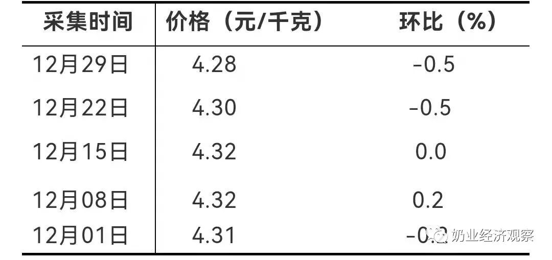 据农业农村部监测数据,12 月生鲜乳价格恢复上涨,但有 3 周价格下跌。12 月月度均价 4.31 元 / 千克,环比上涨 0.1%,同比上涨 3.7%;第 1 周和后 2 周价格环比均下跌,最后一周价格 4.28 元 / 千克,比前一周下跌 0.5%,同比上涨 2.4%。