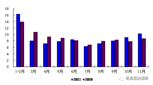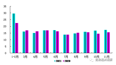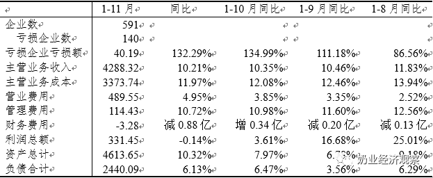 根据国家统计局数据,2021 年 1-11 月进入统计范围的企业 591 家,比 1-10 月数据增加 6 家,其中亏损企业 140 家,比 1-10 月数据增加 3 家,亏损比例 23.7%。