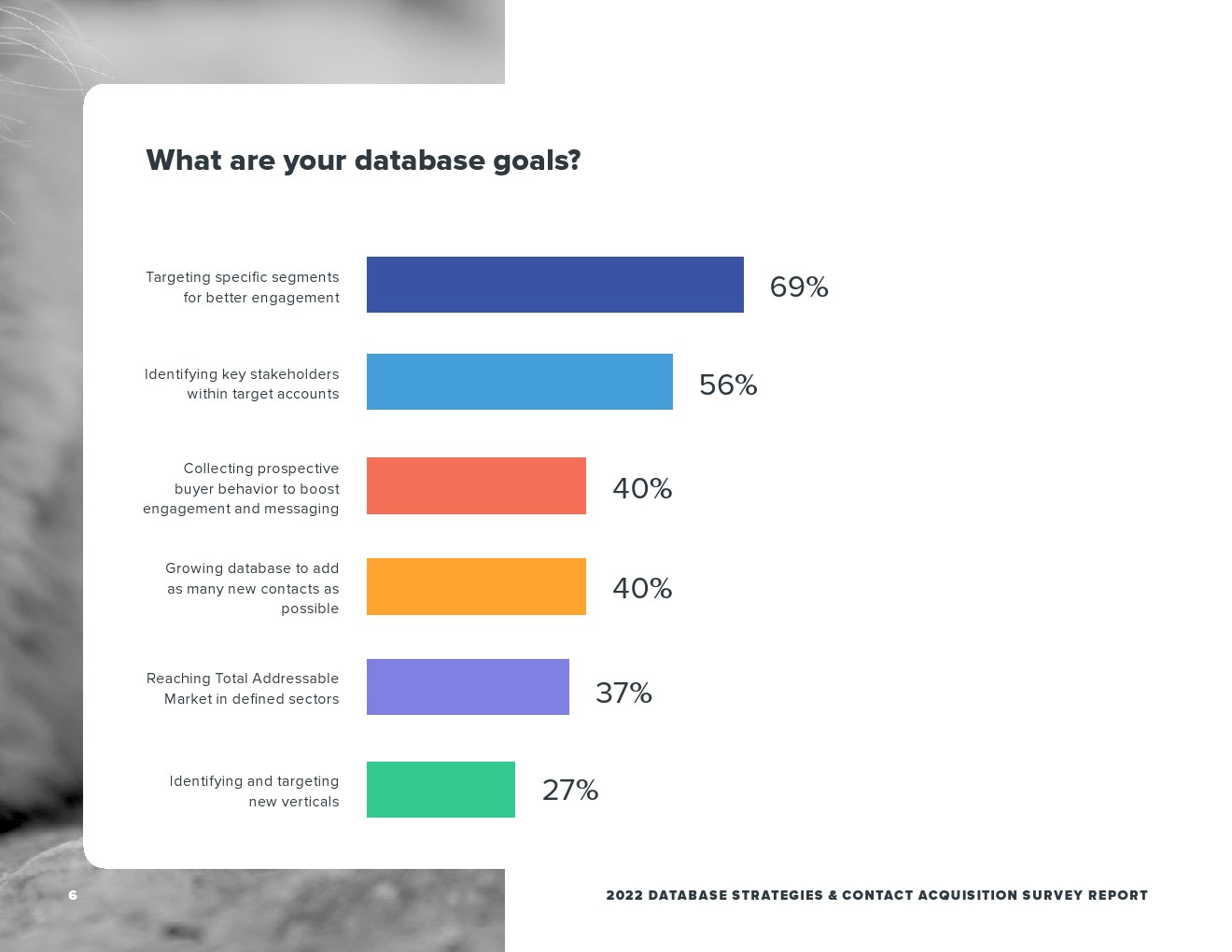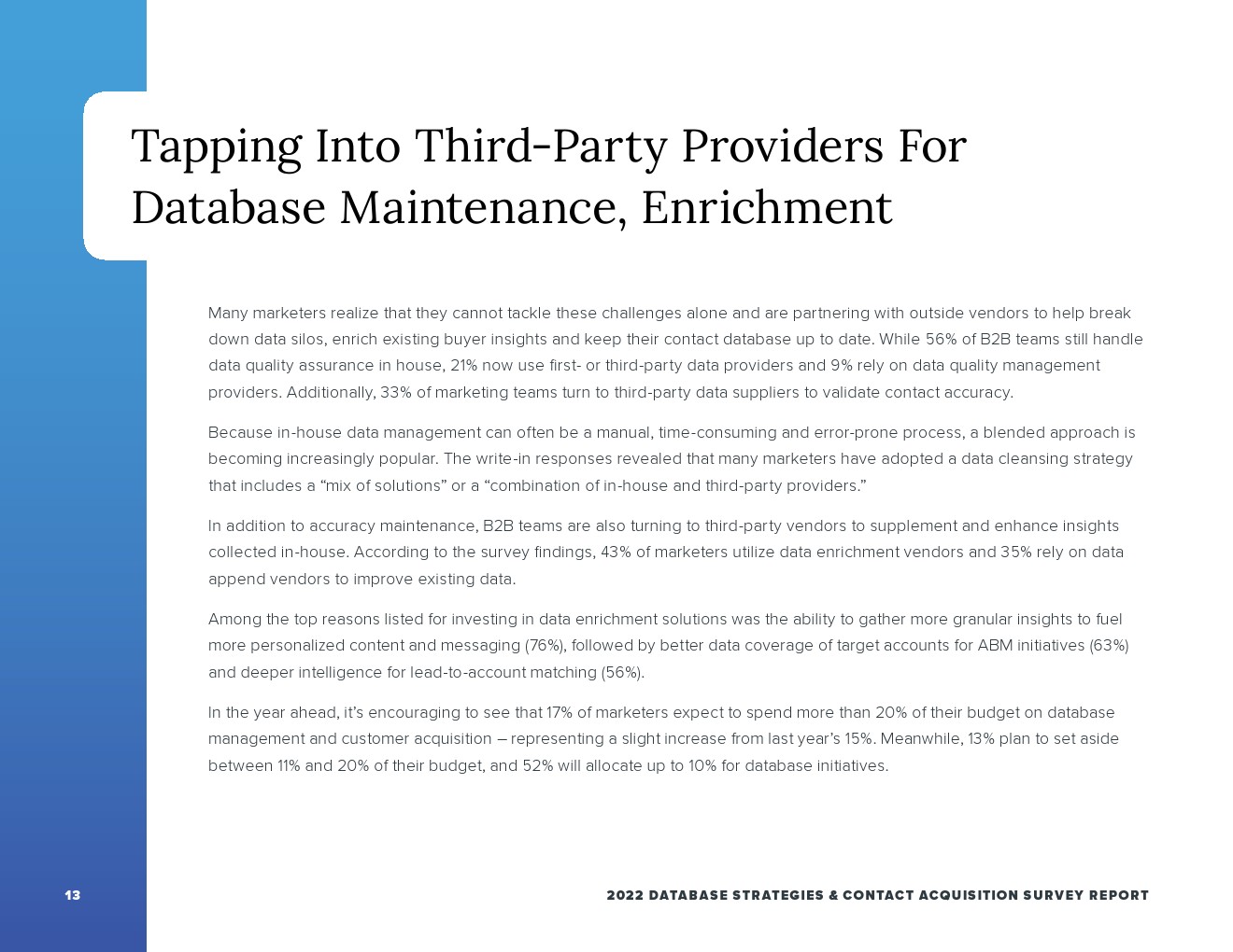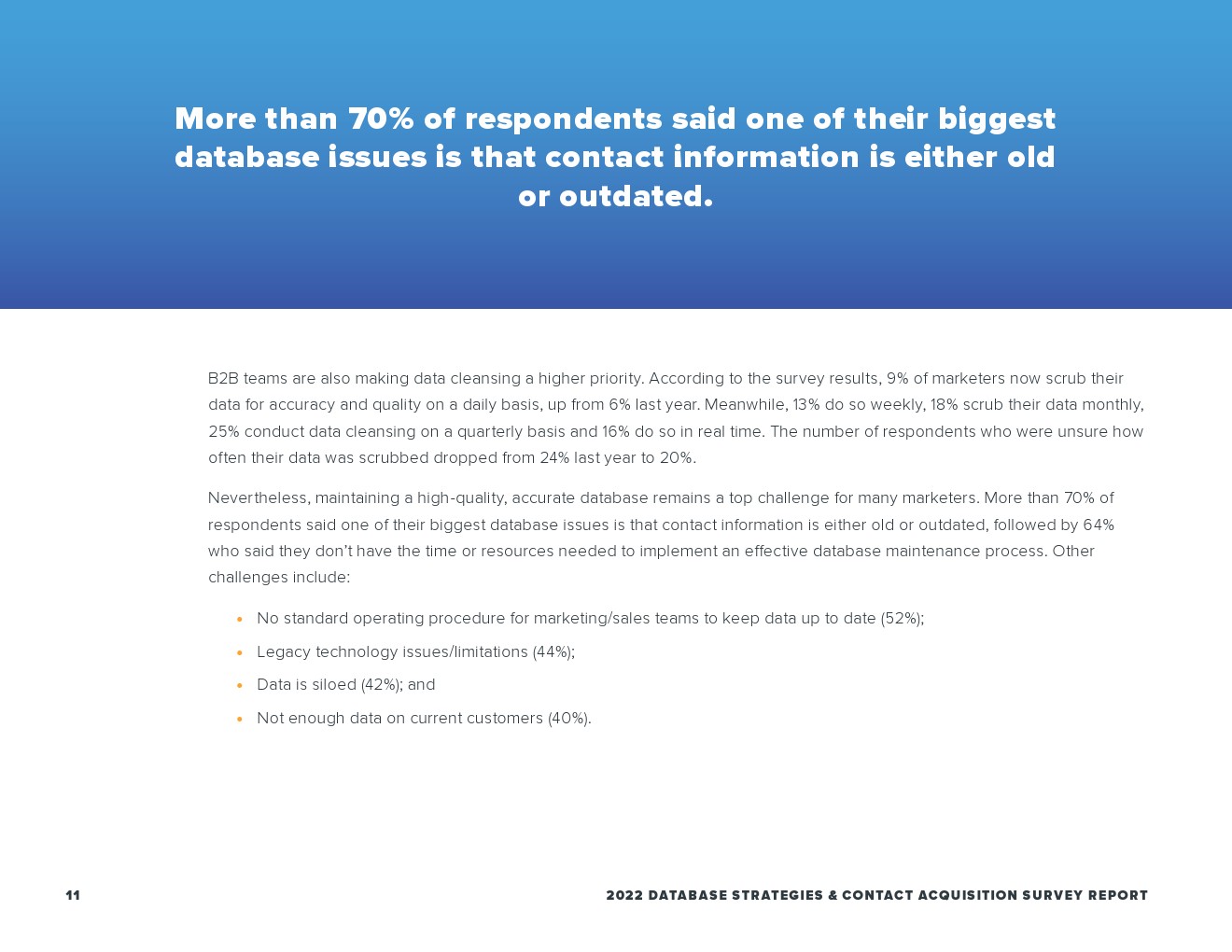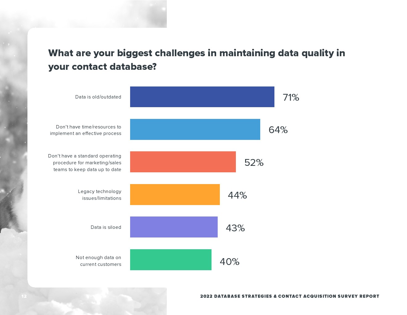 在保持联系人数据库的数据质量方面也存在挑战。71%的受访者认为过时的数据是他们在这一领域面临的最大挑战之一;64%的受访者没有时间或资源来实施有效的过程。