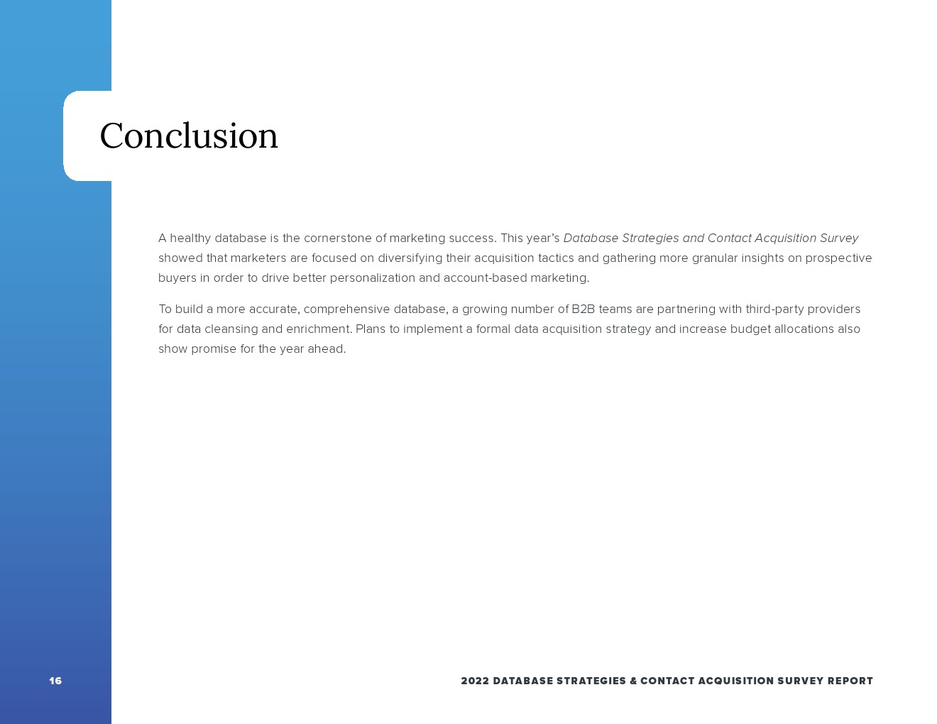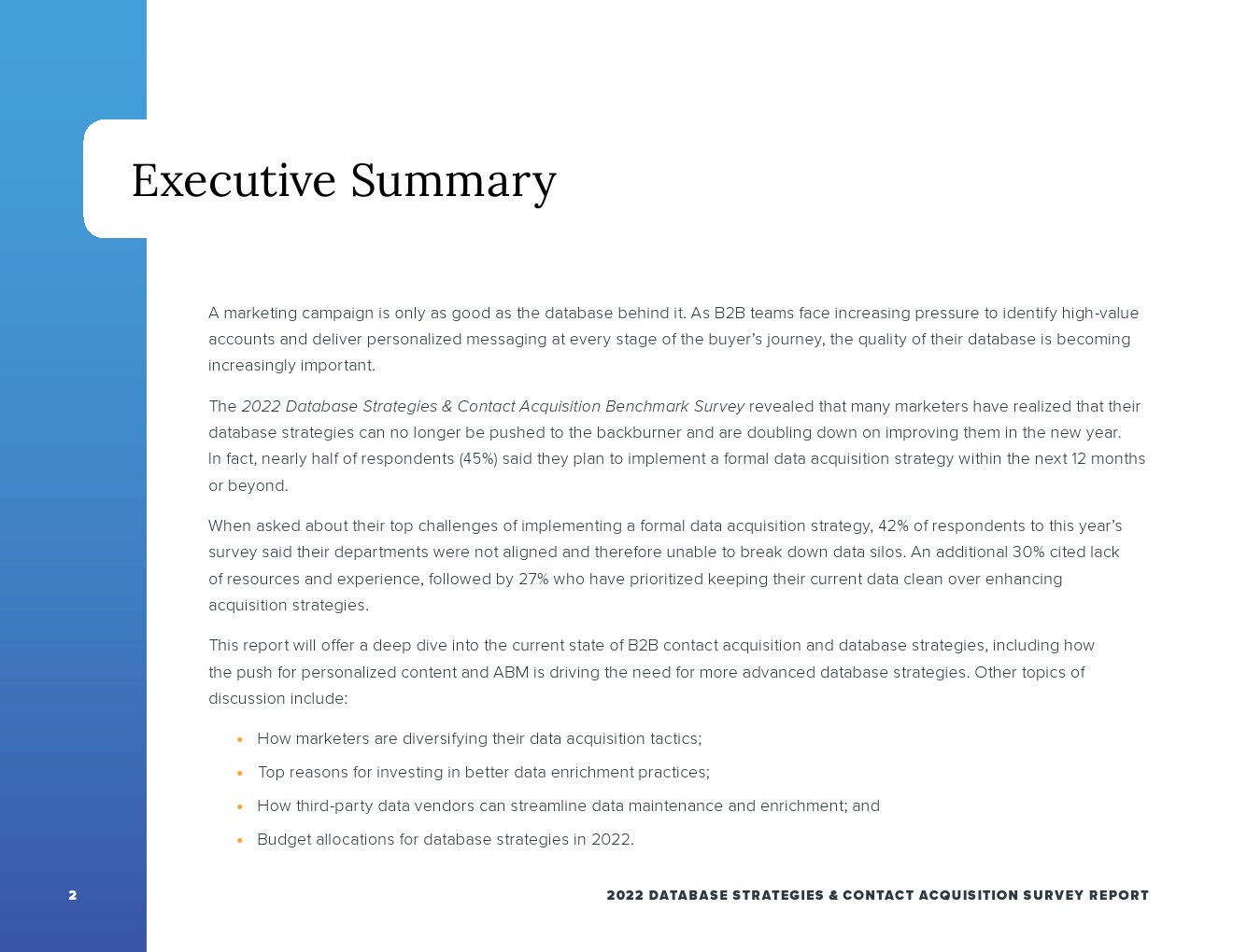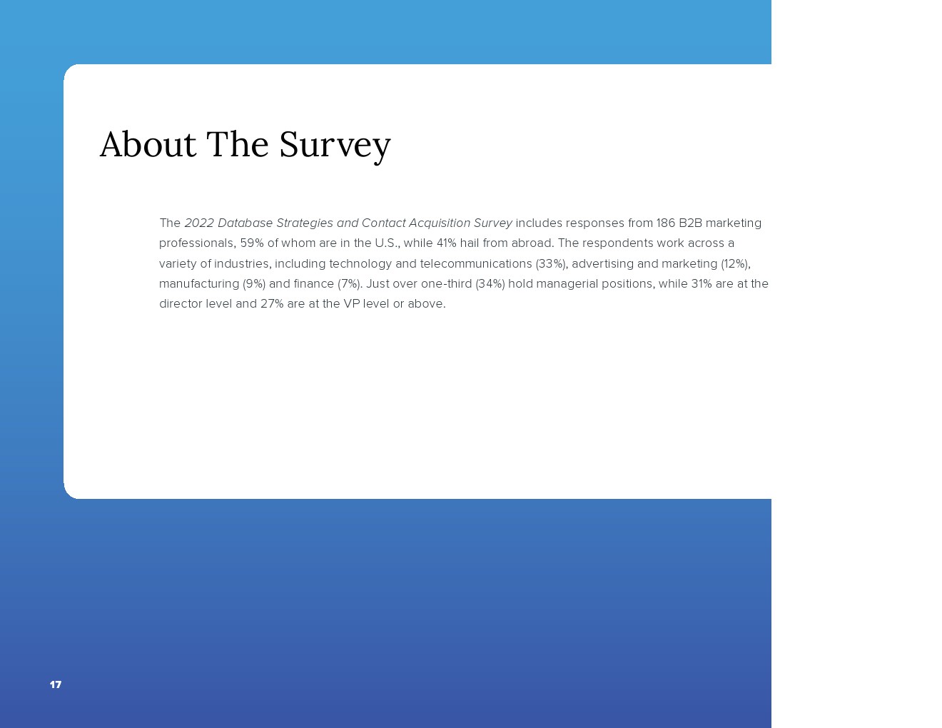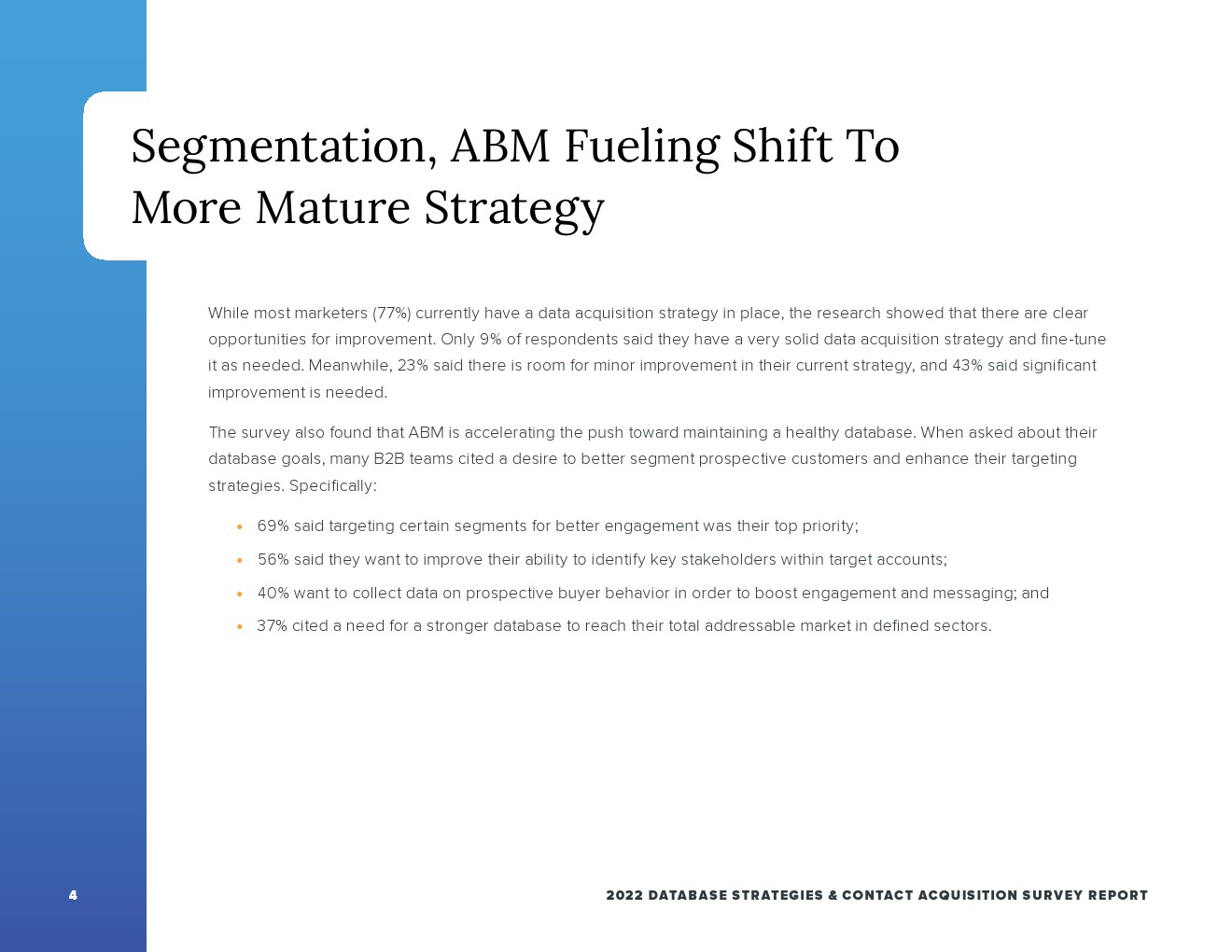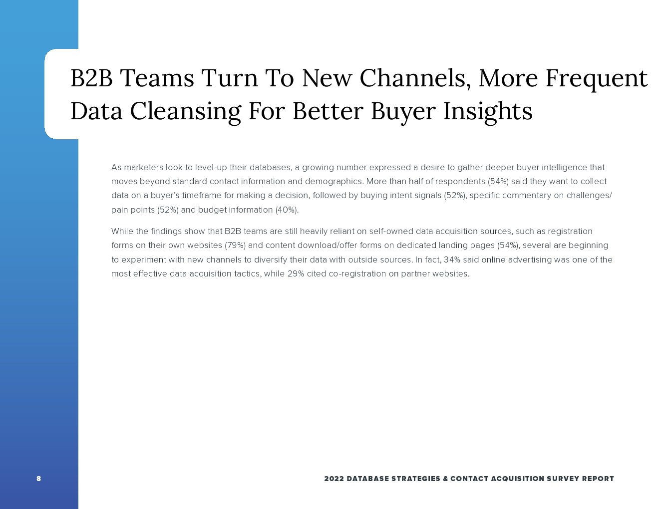在保持联系人数据库的数据质量方面也存在挑战。71%的受访者认为过时的数据是他们在这一领域面临的最大挑战之一;64%的受访者没有时间或资源来实施有效的过程。