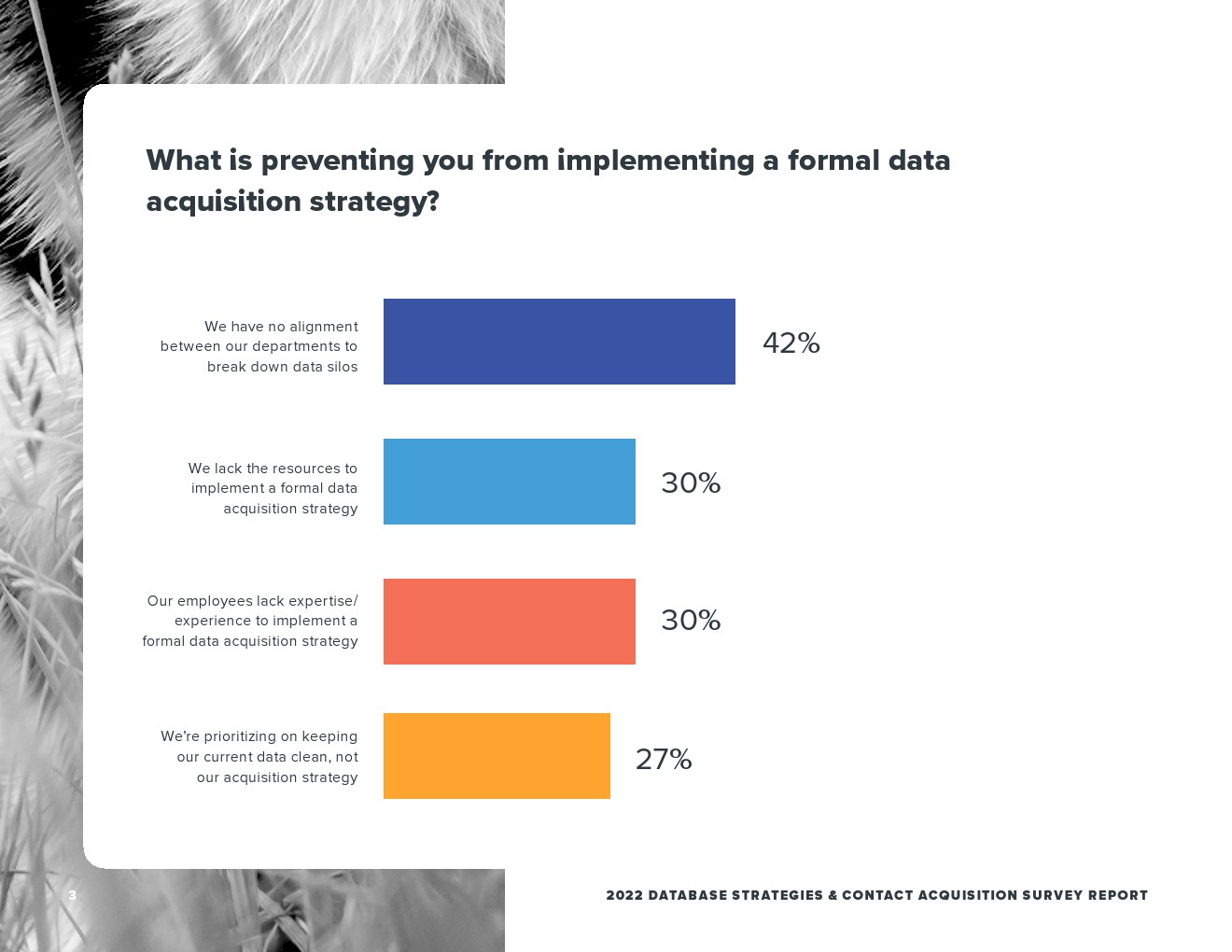 事实证明, 45%的受访者计划在未来 12 个月或更长时间实施正式的数据采集策略。长期以来,孤立的数据一直是从数据中获取洞察的挑战。这阻止了42% 的营销人员实施正式的数据采集策略。