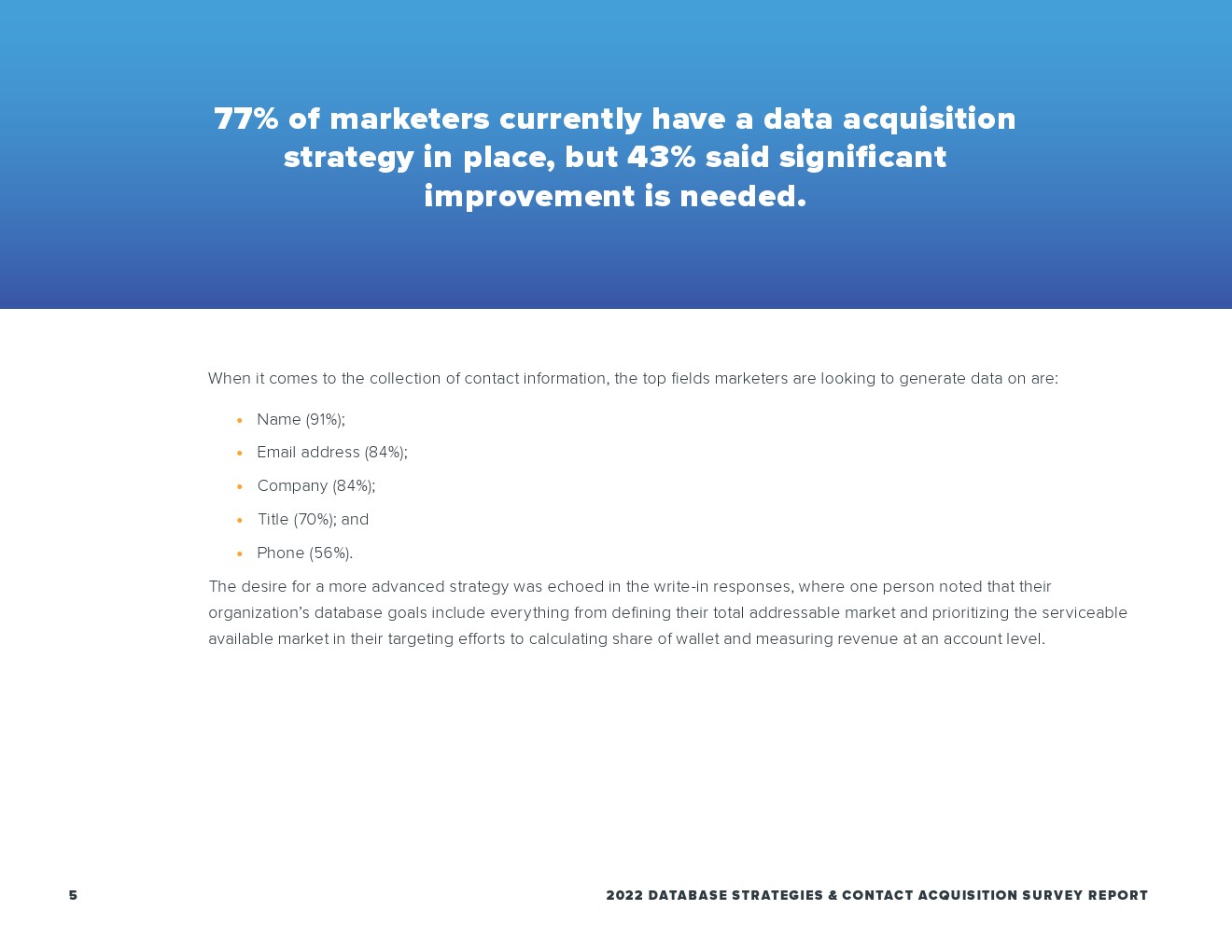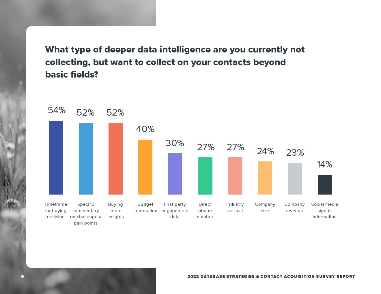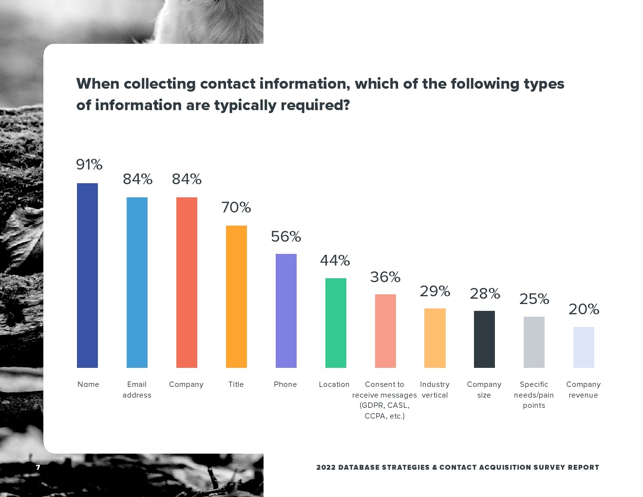 除了收集姓名、电子邮件地址、公司和职位等联系数据,似乎很少有人收集可以帮助他们更好地实现数据库目标的数据。很少有营销人员会收集垂直行业、公司规模和特定需求信息。令人惊讶的是,36%的受访者根据GDPR和CCPA等数据隐私倡议收集信息。
