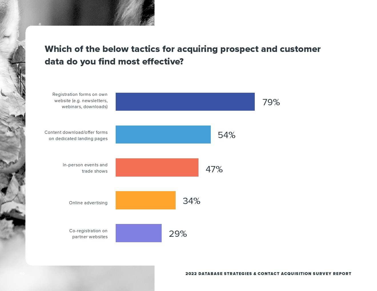 Demand Gen调查了150多名B2B营销专业人士,其中79%将他们自己网站上的注册表单列为获取潜在客户和客户数据的最有效方式之一。54%的受访者认为在专用登陆页面上下载内容或提供表格是获取潜在客户和客户数据的最有效方法之一。有趣的是,早期的研究表明,与营销人员相比,B2B网站访问者对封闭式内容的态度更有利。