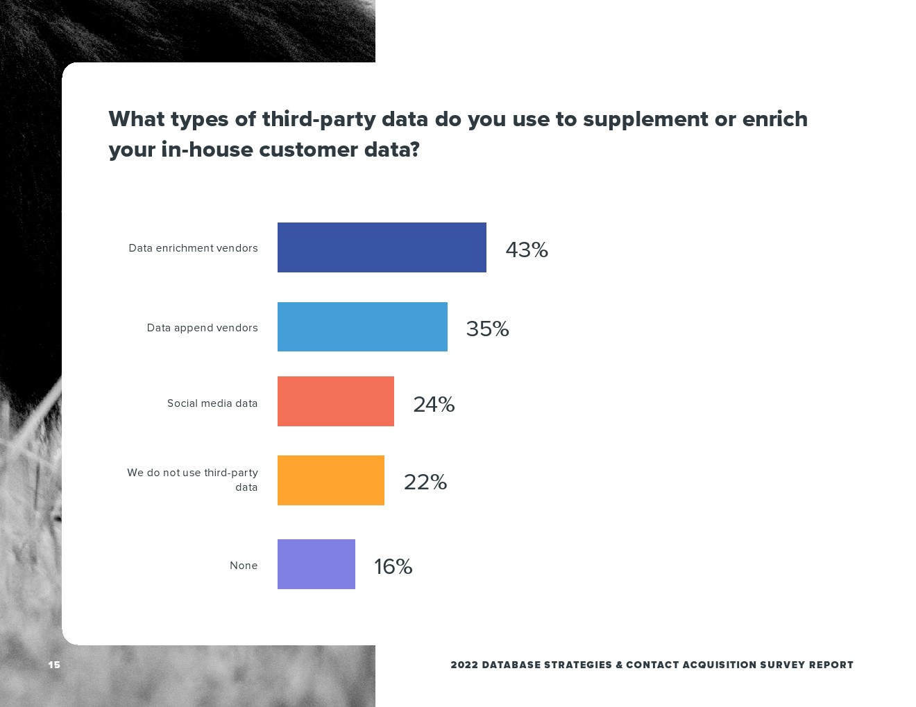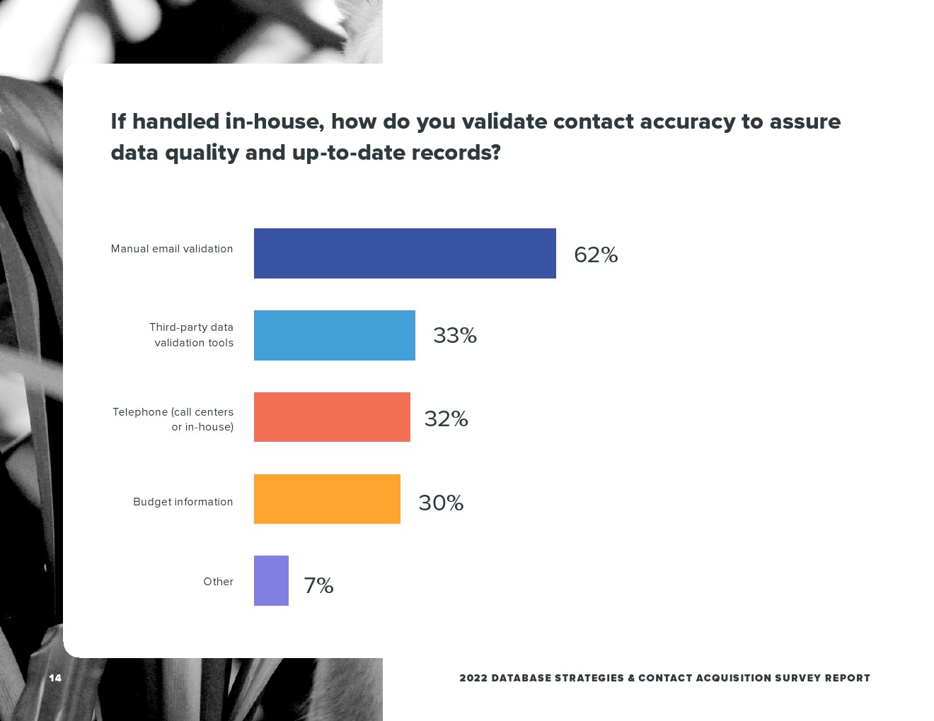 为了确保数据的准确性,56%的受访者在内部保证数据质量。其他人则转向第一方或第三方数据提供商(21%)和数据质量管理提供商来保证数据质量。33%的受访者使用第三方数据供应商来验证准确性。