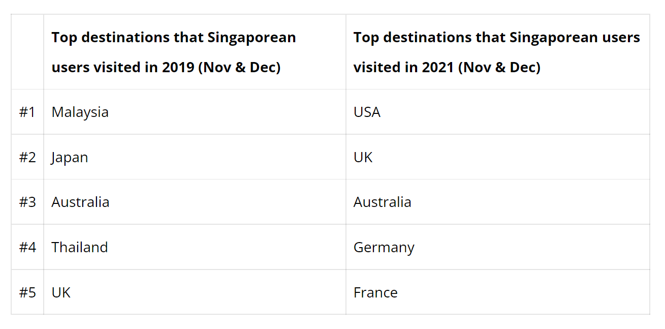 新加坡人在在家呆了这么久后也准备去更远的地方,将他们从 2019 年对亚洲国家的偏好转移到偏远目的地: