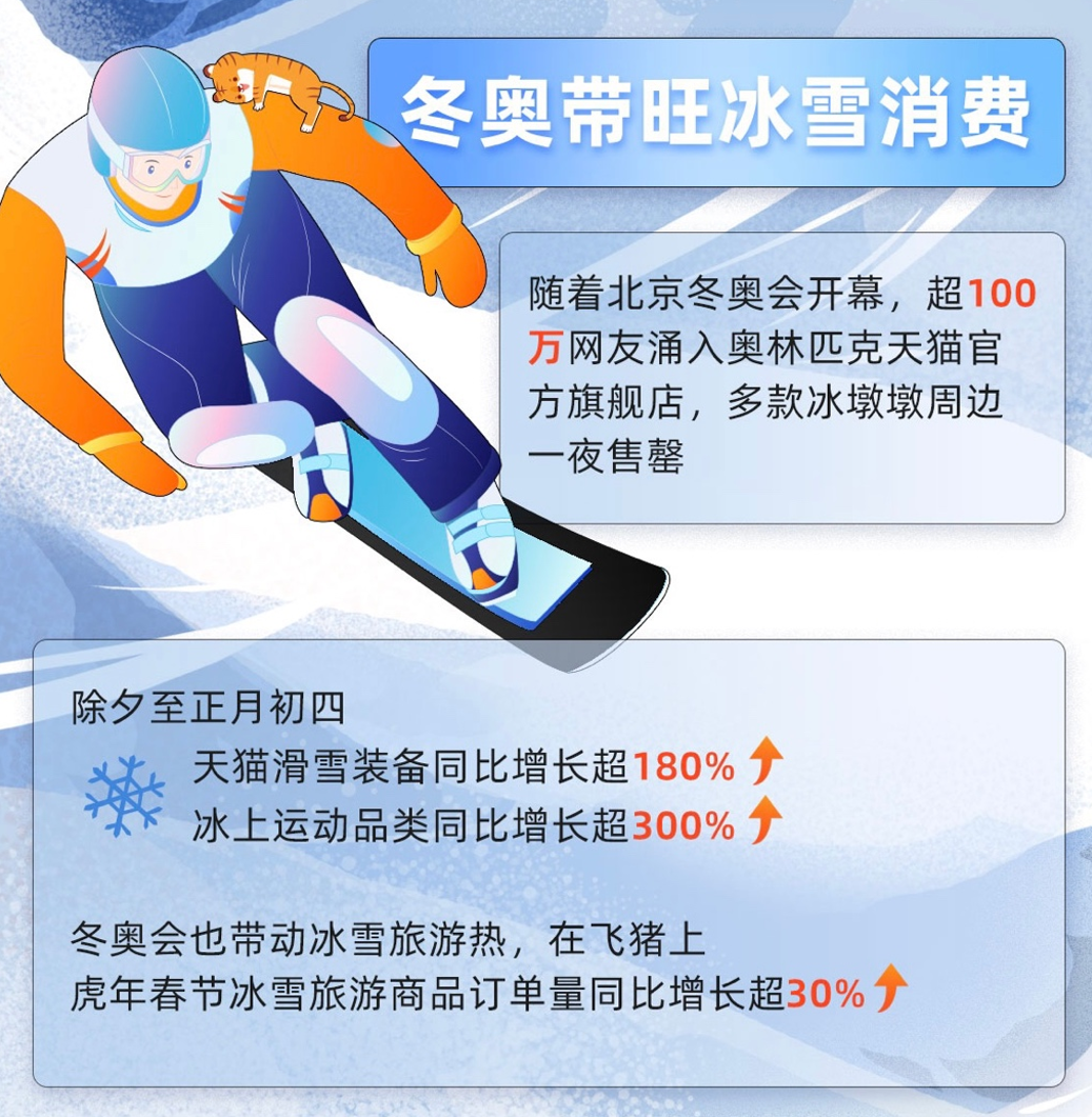 冬奥会也带动冰雪旅游热。在飞猪上,春节期间冰雪旅游商品订单量同比增长超30%。吉林长白山、黑龙江亚布力、湖州安吉等滑雪胜地的订单快速增长,广州、重庆、成都等地的室内滑雪场也成为热门去处,“3亿人参与冰雪运动”正在成为现实。