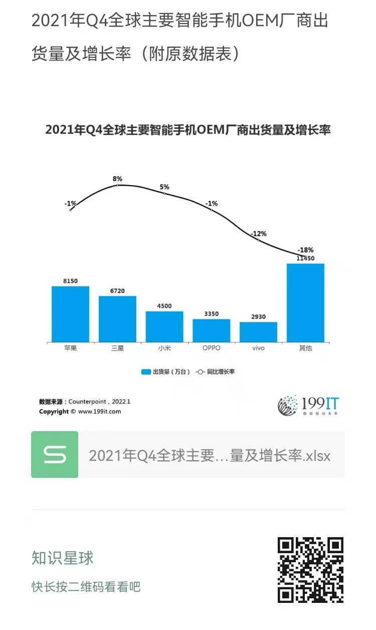 - 2022年Q4全球主要智能手机OEM厂商出货量及增长率(附原数据表)