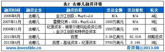 点评:从公司高管2009年第一次宣布“力争一年半后在香港或美国上市”已经4年之久,2013年,去哪儿网可能成为今年中国公司登陆美国第一股的传闻又一次流传于投资银行圈。去哪儿现任CEO庄辰超在百度投资时大幅套现稀释了持股比例,IPO进程完全取决于控股大股东百度手中。