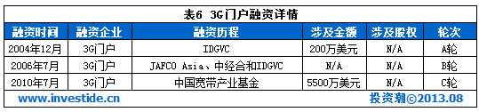 投资方:2010年第三轮融资数千万美元,由中国宽带产业基金、IDGVC、集富亚洲、美国中经合集团四家提供。3G门户的前两轮风险投资分别在2005年、2006年,由JAFCO ASIA (集富亚洲)、WIHARPER(美国中经合集团)及IDG VC三家国际著名风险投资公司投资,金额超千万美元。
