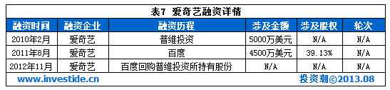 点评:2011年8月和11月,百度斥资2.8323亿元收购爱奇艺39.13%股B轮可转换优先股,累计获得爱奇艺53%股权。2012年公布财报期间,百度宣布收购私募公司普维投资持有的爱奇艺股份,成为爱奇艺单一大股东。百度持续增持爱奇艺股份,并继续在资金、资源和团队激励方面加大对爱奇艺的支持力度,表明爱奇艺未来独立上市步伐正在加速。2013年3月底,爱奇艺刚通过百度3.7亿美元将PPS并到爱奇艺旗下,便宣布会在合适的机会寻求IPO,百度在视频领域的扩张野心可见一斑。若爱奇艺IPO大获成功,将对百度有重大战略意义。