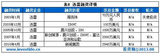 投资方:2003年1月,深圳市迅雷网络技术有限公司成立,获得周鸿祎天使投资70万元人民币。12月,获得IDGVC投资100万美元。2005年10月晨兴创投联合IDG投资约1000万美元。2007年1月联创策源领衔晨兴创投、IDGVC、富达亚洲和谷歌等联合投资2000万美金,其中联创策源投入约1000万美元,Google战略投资500万美元;2010年4月,新闻集团默多克通过家族基金投资迅雷,投资额约2940万美元。