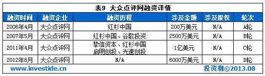 投资方:2006年4月,大众点评网A轮融资获红杉中国投资200万美元;2007年5月,大众点评网B轮融资又获得红杉中国与谷歌投资联投2500万美元; 2011年4月,大众点评网C轮融资获得来自挚信资本、红杉中国、启明创投、光速创投4家机构联合投资,总额超过1亿美元。2012年8月大众点评网D轮融资再获6000万美元。