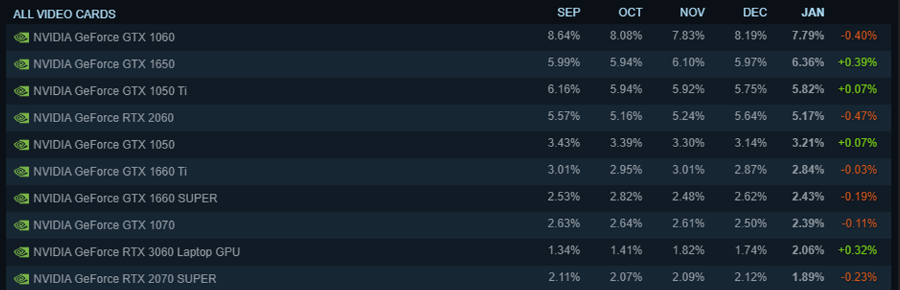 今天,Steam公开了2022年一月份的硬件和软件调查报告,在此次报告上,RTX 30系显卡第一次跻身前十。根据数据来看,在一月份,Steam上使用最多的显卡依旧是GTX 1060,但占比相比之前略有下降;而后,GTX 1650及GTX 1650 Ti的使用量出现了小幅增长。