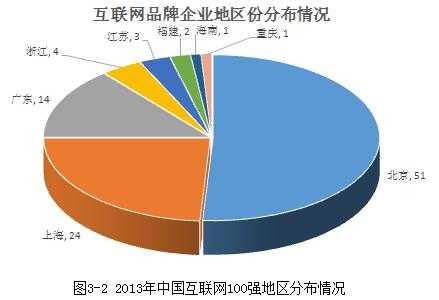100强的地区分布情况为:北京51家、上海24家、广东14家、浙江4家、江苏3家,基本上全部位于经济发达省份。其中京沪粤三地占比近90%,这在一定程度上反映了互联网行业发展状况与地方经济发展情况的高度关联性。