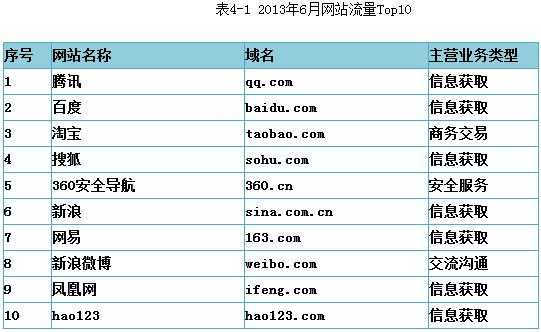本篇关注的对象是网站。本篇从网站流量角度,评价互联网网站。由于时间关系,本次计算,采用指标仅包括PV。表4-1为流量排名的Top10网站。