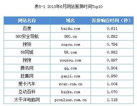 速度是反映用户网络体验的重要指标之一,也是评价网站服务质量的有效途径。根据对国内网民最常访问的400家网站的测速结果,访问速度较快的前100家网站的平均首屏时间为2.491秒。其中前10家网站首屏时间如表5-1所示。