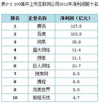 100强2012年营收总规模超过2000亿元,其中腾讯、阿里巴巴、百度营收过百亿;网易、搜狐、当当营收超50亿;营收过10亿的企业有30余家。腾讯公司创收能力最强,全年营收超过400亿元,占100强企业收入总和近五分之一,稳坐领头羊位置。
