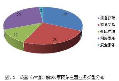 将网站业务类型分为信息获取、商务交易、交流沟通、网络娱乐和安全服务五个类型。在流量(PV值)排名前100家网站中,信息获取类网站32家,网络娱乐类网站29家,商务交易类网站25家,交流沟通类网站12家,安全服务类网站2家。如图4-1所示。