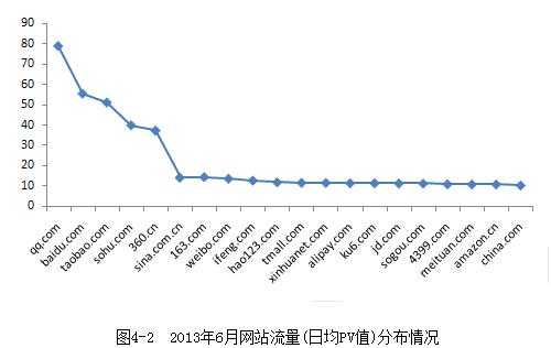 从流量分布来看,网民关注度高的几家大网站PV值较高,与其他网站差别较大,形成第一个梯队。其他网站分值之间呈平滑下降趋势,形成第二个梯队,如图4-2所示。