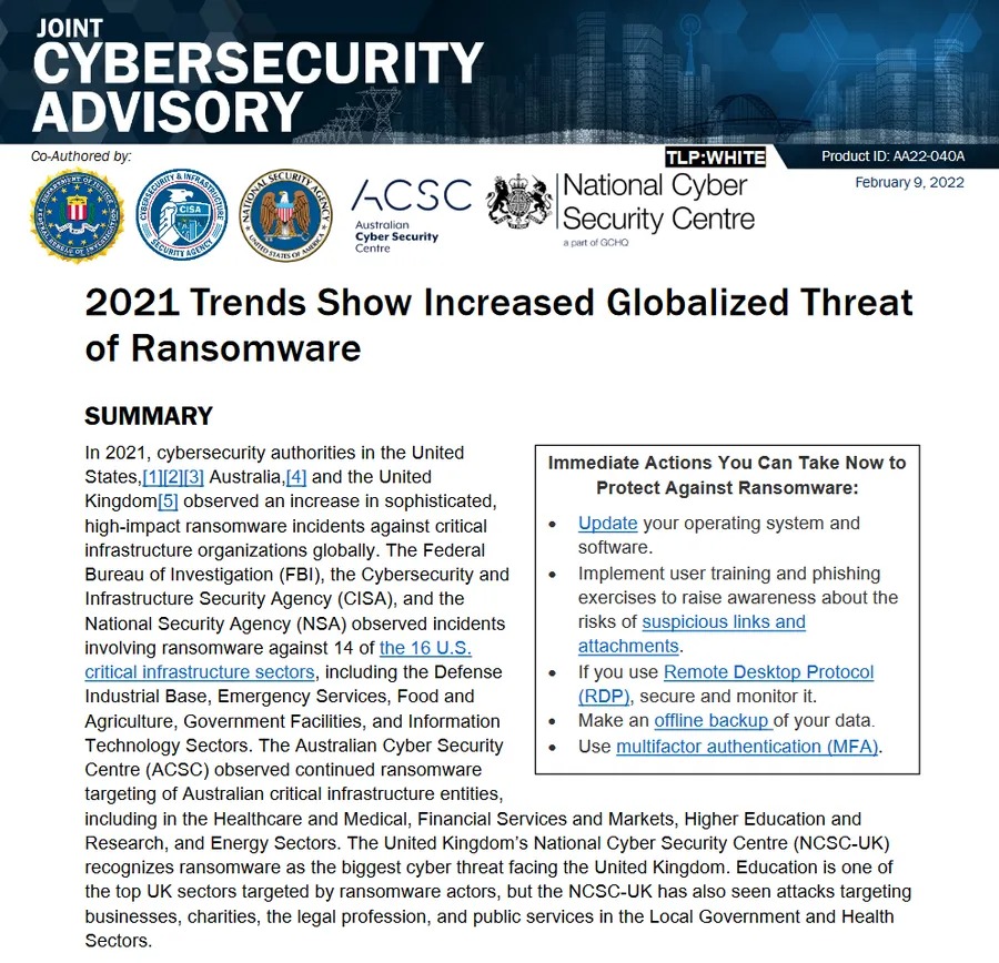 现在每个政府、每个企业、每个人都必须关注勒索软件的威胁,并采取行动减轻成为受害者的风险。降低勒索软件的风险是 CISA 作为国家网络防御机构的核心任务,虽然我们在过去一年中已经在提高对威胁的认识方面取得了进展,但我们知道还有更多的工作要做,以建立集体复原力。
