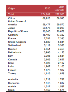 2021年,国际申请中包含的外观设计项数增长了20.8%,达到22480项,是2010年以来增长最快的一年。