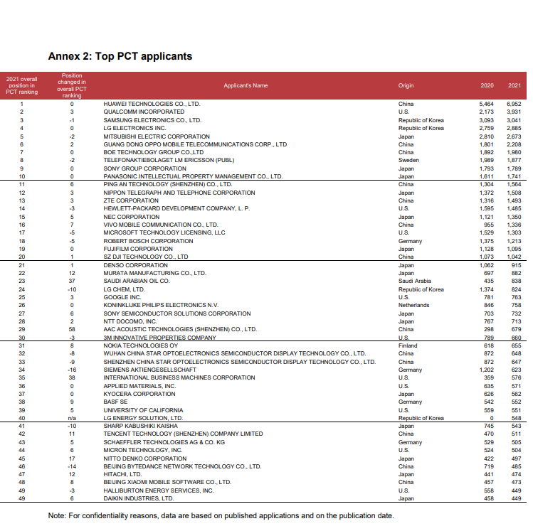 如果以公司排名来看,WIPO的数据显示,中国华为技术有限公司以6952件已公布PCT申请成为2021年的最大申请人,其后是美国高通公司(3931件)、韩国三星电子(3041件)、韩国LG电子公司(2885件)和日本三菱电机株式会社(2673件)。
