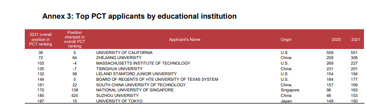 在教育机构中,2021年,加利福尼亚大学以551件已公布申请继续在教育机构中排名榜首。浙江大学(306件)位列第二,其后是麻省理工学院(227件)、清华大学(201件)和斯坦福大学(194件)。 WIPO表示,上榜的前十所高校中,中国和美国各占四所,日本和新加坡各占一所。