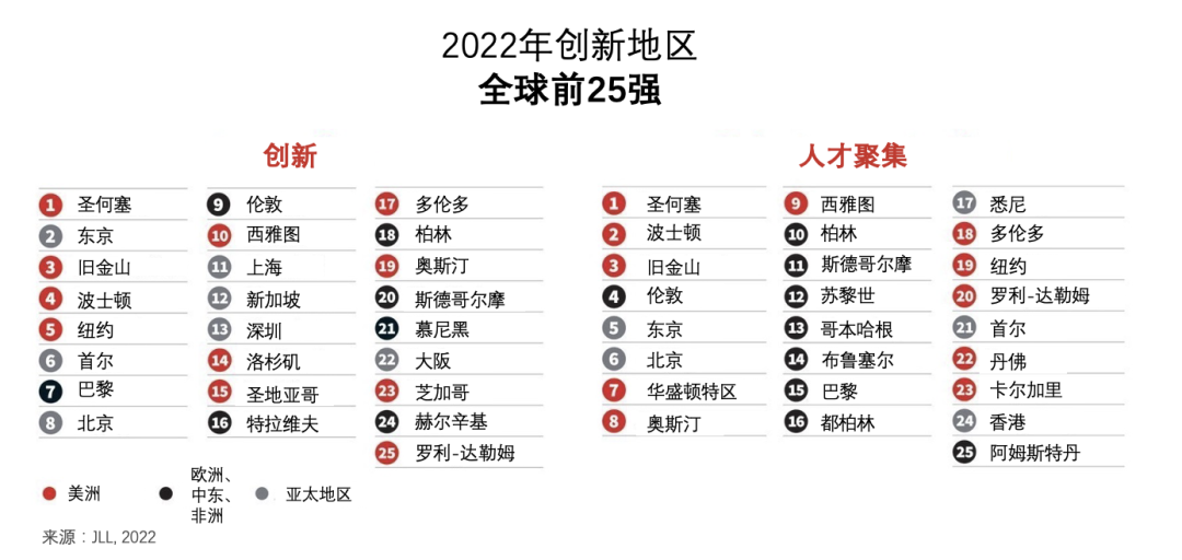 根据房地产公司 JLL 的最新报告《创新地区》(Innovation Geographies),如今,各企业正寻找适合扎根办公的人才热点地区,那些创新和人才实力强劲的地区在经济活动方面表现优于其他地区,并创造了房地产资本流。这项对 100 多个城市展开的分析——最后一次进行于 2019 年——对创新和人才进行了衡量,并涉及房地产投资。