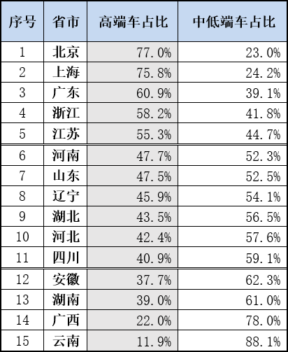根据乘联会区域流向的统计,全国 31 个省市中,我们选出 TOP15 的省市,共分三组,在第一矩阵中,高端 MPV 在当地全部 MPV 销量占比超过 50%,它们是北京、上海、广东、浙江和江苏,这些是国内省市的经济龙头地区,其中北京上海均超过了 70%;第二矩阵的是河南、山东、辽宁、湖北、河北和四川,它们高端 MPV 的占比处于 40-50% 之间,属于中游;第三矩阵的是排名第 12-15 位的省市,它们是安徽、湖南、广西和云南,高档车占比低于 40%(见下表)。