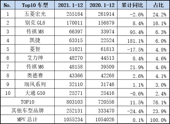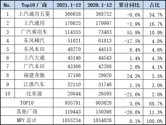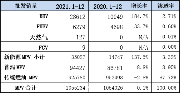 2021 年全年销售数据出来了, 12 月 MPV 批发销售完成 11.3 万辆,同比下降 20.8%,环比增长 4.7%;全年累计销量 105.5 万辆,同比增长几乎持平,仅增长 0.1%。MPV 在狭义乘用车市的渗透率为 5.0%,比去年同期减少 0.3 个百分点。