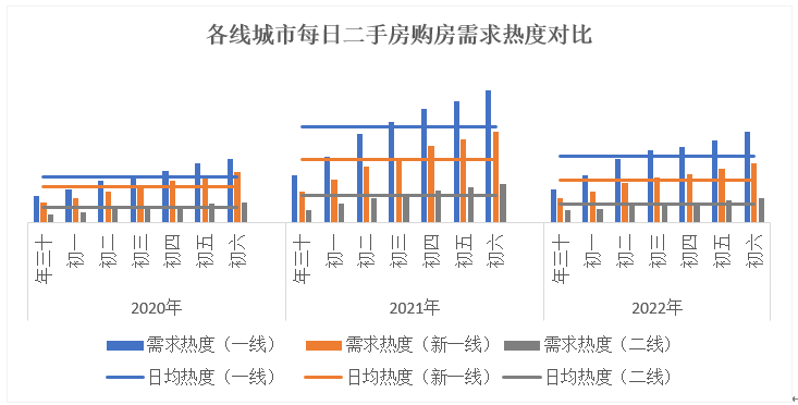 58 安居客房产研究院统计数据显示:2022 年春节期间各线城市二手房购房需求热度整体走势基本和 2021 年春节相当,购房需求热度基本都在初三开始达到平均水平线之上,不过日均水平线出现较大幅度的下移,其中今年一线城市的购房需求热度和去年接近。