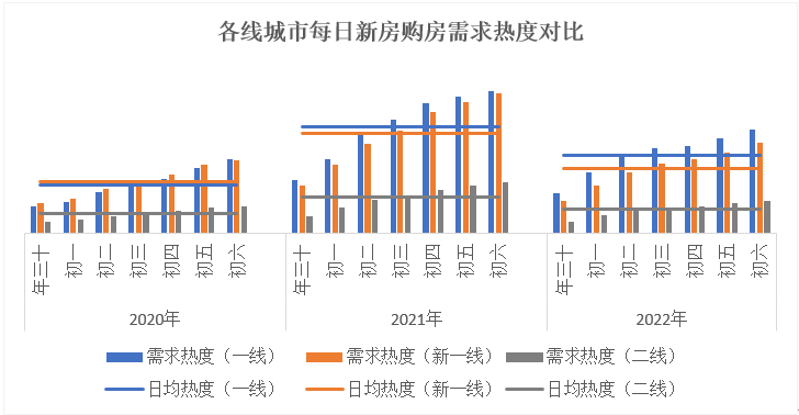 据 58 安居客房产研究院统计数据显示,2022 年春节期间各线城市新房购房需求热度在年初三基本都开始恢复到平均水平线之上,基本上和前两年相当。而今年新一线城市新房购房需求热度恢复速度会慢一些,在 2021 年春节期间新房市场购房热度明显更高,初六的购房需求热度已经和一线城市相当的水平,而今年还是有较大差距。