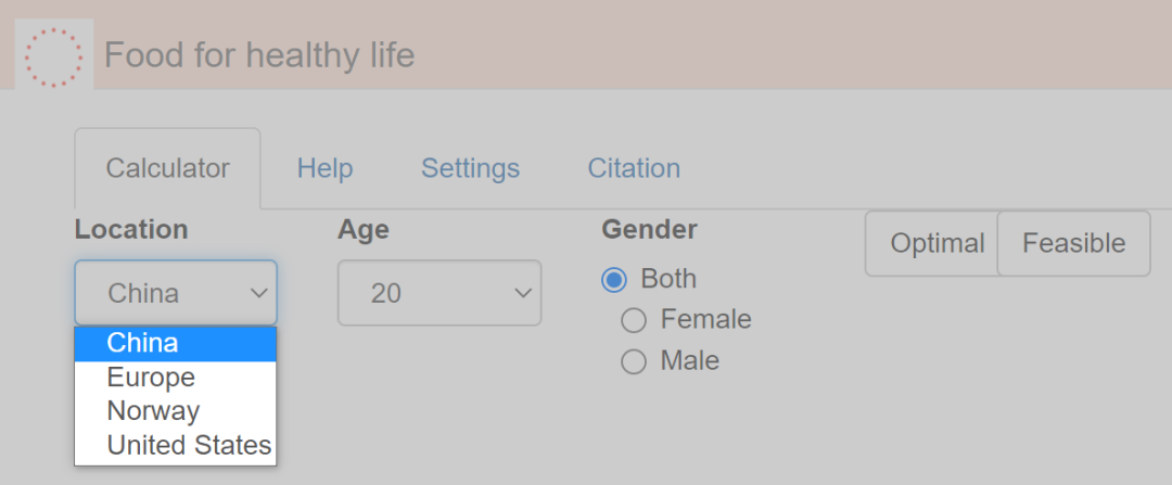 通过该计算工具,选择之前的饮食模式和转换后的饮食模式(包括全谷物、鱼类、加工肉类、坚果、红肉、豆类、牛奶、蔬菜、水果、含糖饮料、精制谷物、鸡蛋、白肉和油的摄入量)、所处的地区(目前分为中国、欧洲、挪威、美国)、开始的年龄、性别,就能得出转换饮食模式对预期寿命的改变。