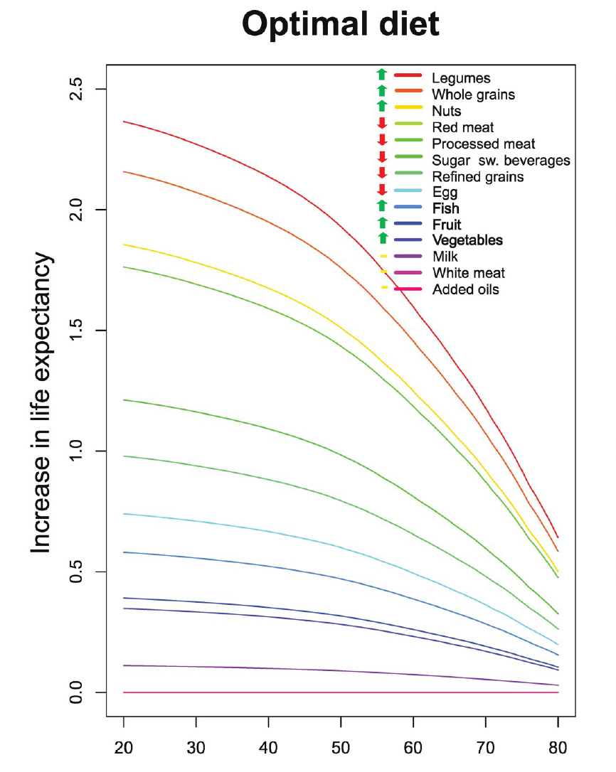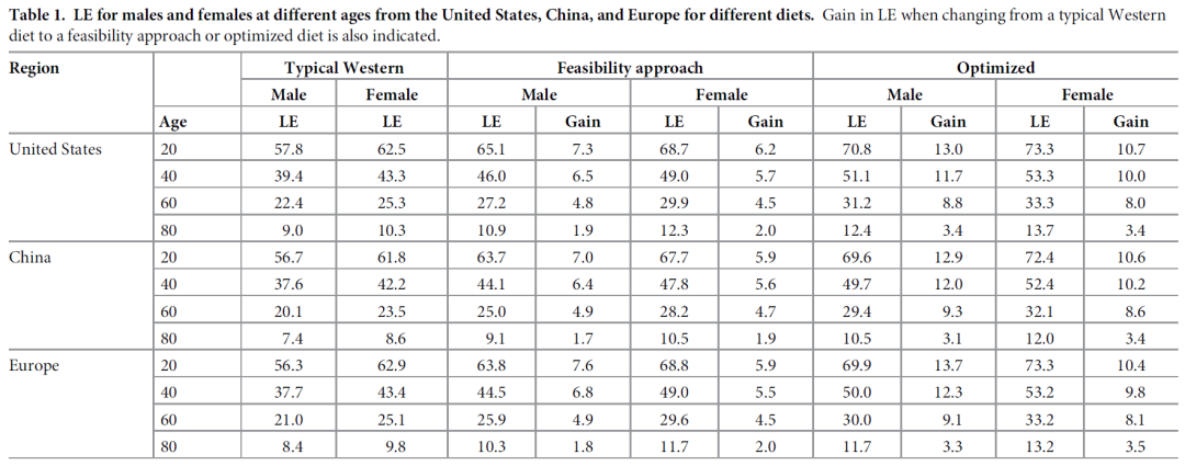 对于中国年轻人来说,该计算模型估计,从 20 岁开始从典型西式饮食持续转变为优化饮食,将使女性的预期寿命增加 10.6 年,将使男性预期寿命增加 12.9 年。从 40 岁开始转换饮食,女性预期寿命增加 10.2 年,男性预期寿命增加 12.0 年。从 60 岁开始转换饮食,女性预期寿命增加 8.6 年,男性逾期寿命增加 9.3 年,从 80 岁开始转换饮食,女性预期寿命增加 3.4 年,男性逾期寿命增加 3.1 年。