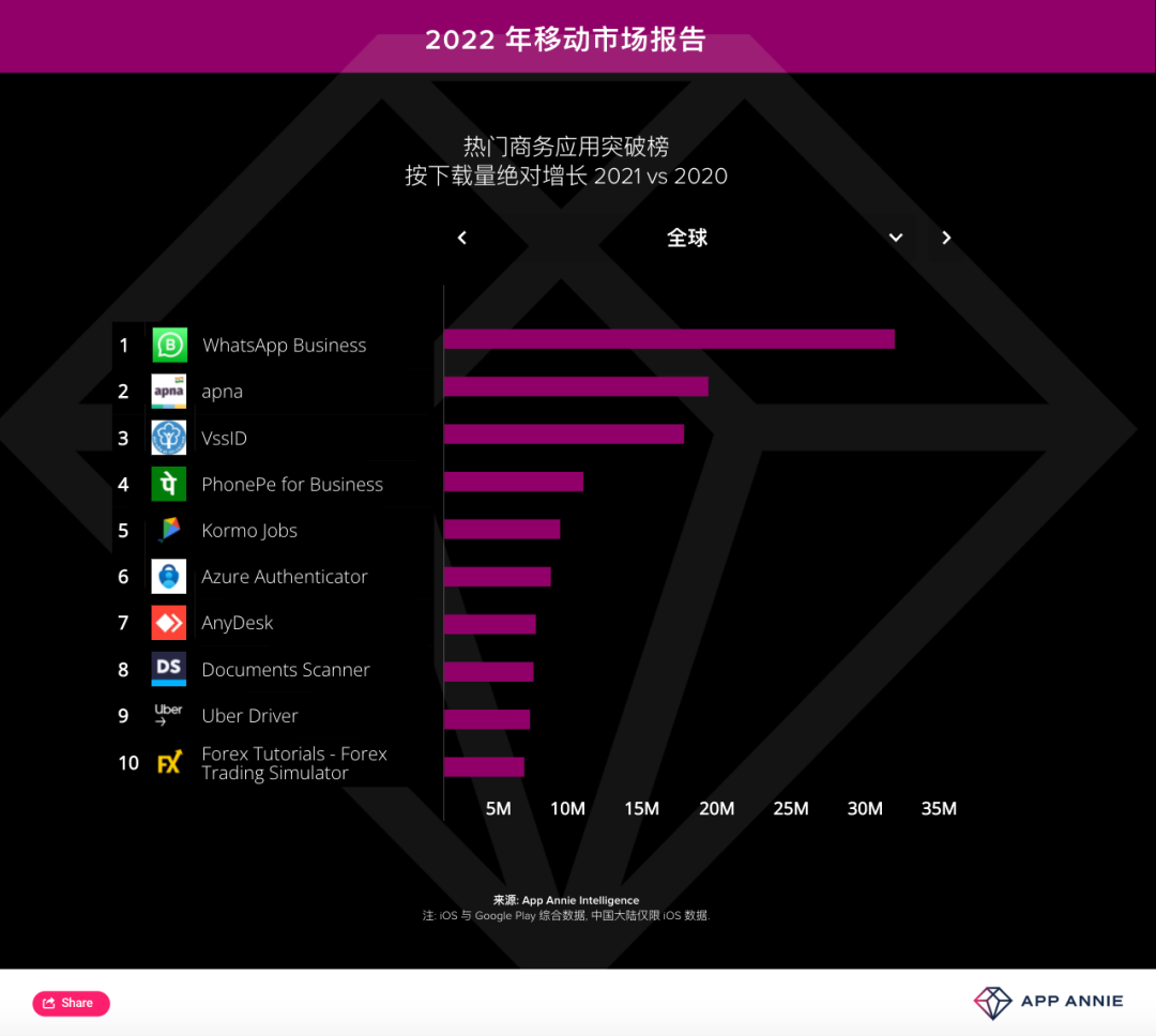 此外,还有世界上增长最快的商务应用:WhatsApp Business。该应用属于Meta 旗下,允许公司利用丰富的消息渠道进行销售、营销和提供客户服务。这是另一个可以让小企业和个体经营者重获自主权的工具。2020 年,Meta 证实使用它的公司超过 5,000 万家。而我们的数据显示,在 2021 年,它的下载量同比增长了 3,030 万。