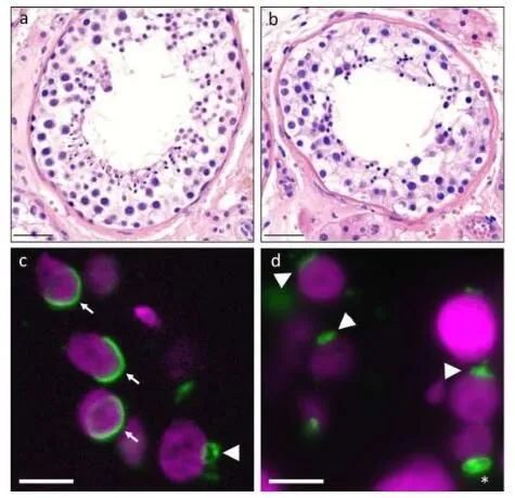对对照和TOPAZ1先证者进行睾丸组织学和异常顶体形成的描述。
